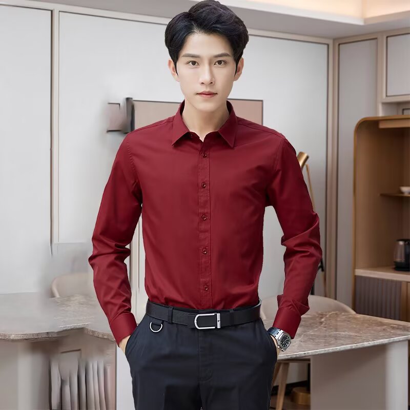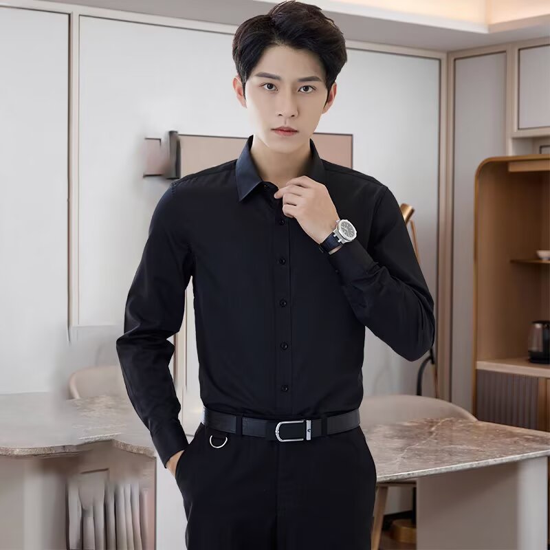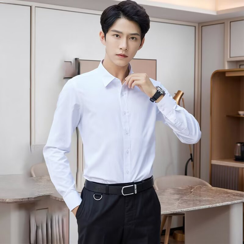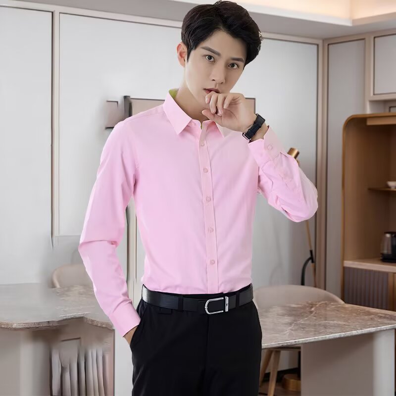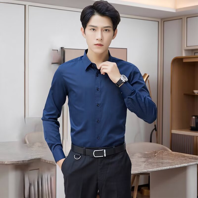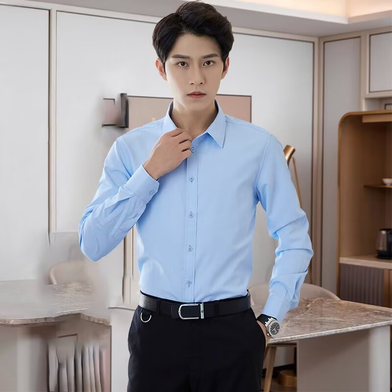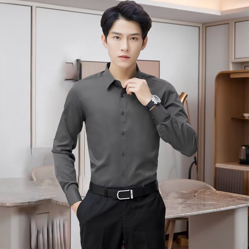 봄 한국 스타일 패션 고급 셔츠 남성 솔리드 컬러 비즈니스 정장 통근 노다림 주름 방지 긴팔 셔츠 겉옷