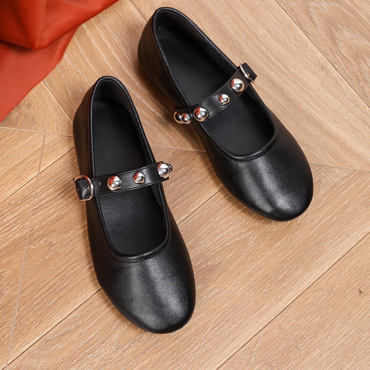 2025 봄과 가을 새로운 여성 신발 리벳 가죽 메리 제인 라운드 발가락 프렌치 슈즈 발레 스타일 플랫 슈즈 크로스스토어 가기