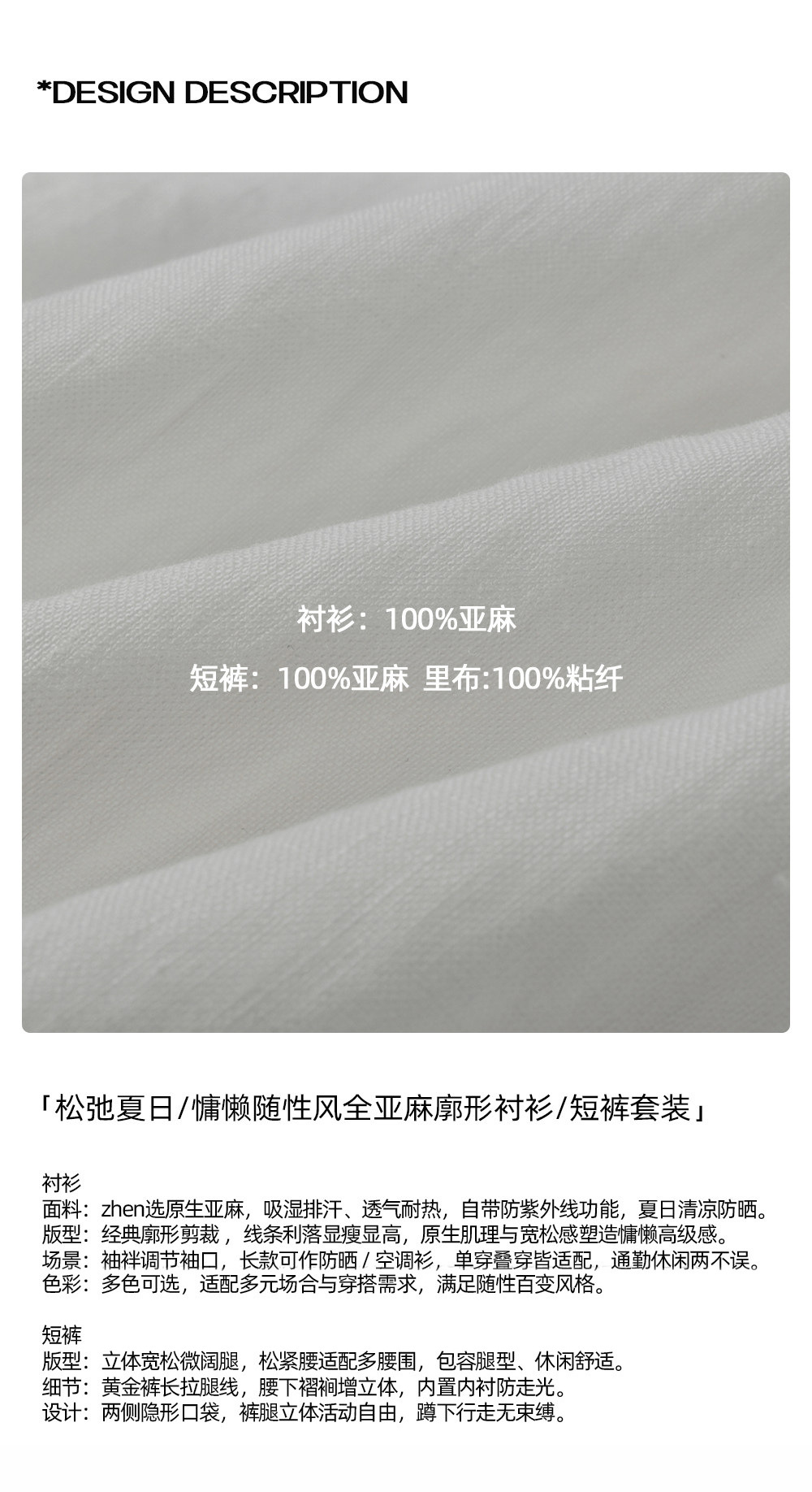 [고급상품] 100% 린넨 소재, 조절 가능한 소매끈이 있는 자외선 차단 실루엣 셔츠 + 올드머니 스타일의 루즈핏 드로스트링 반바지스토어 가기