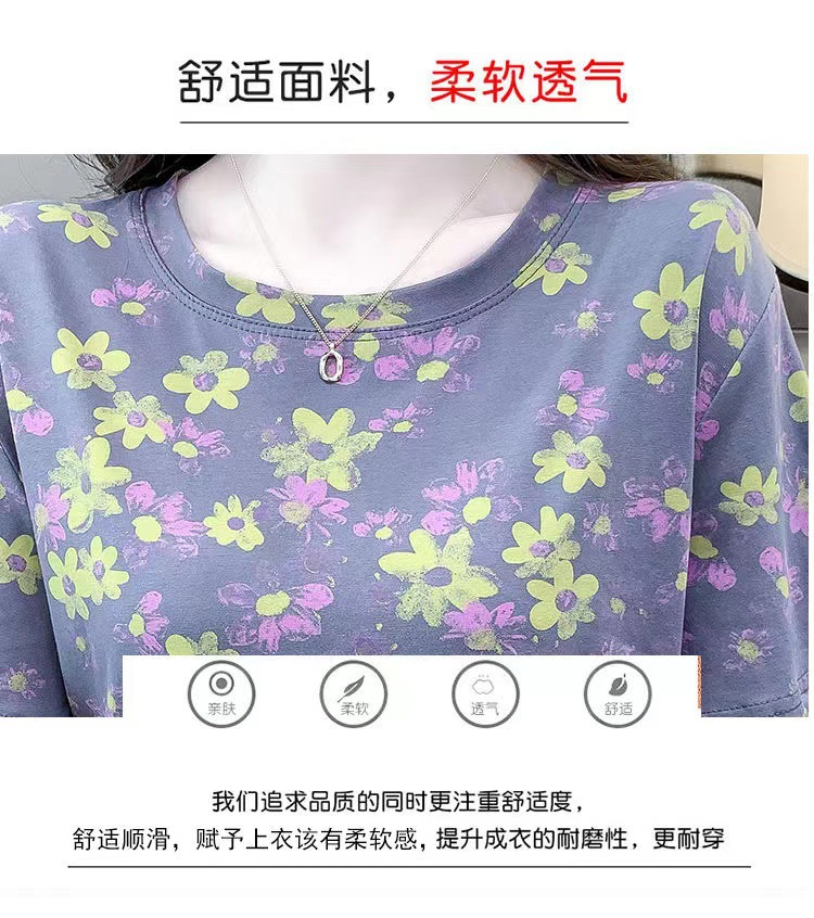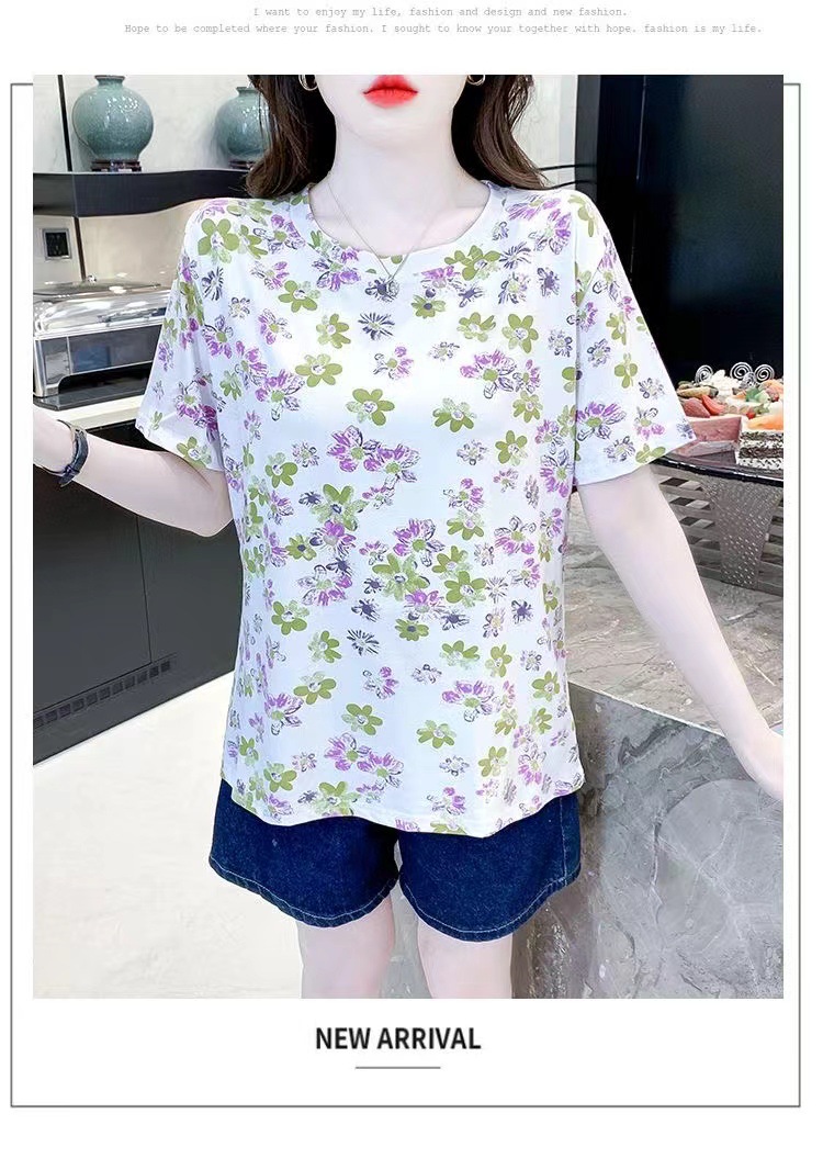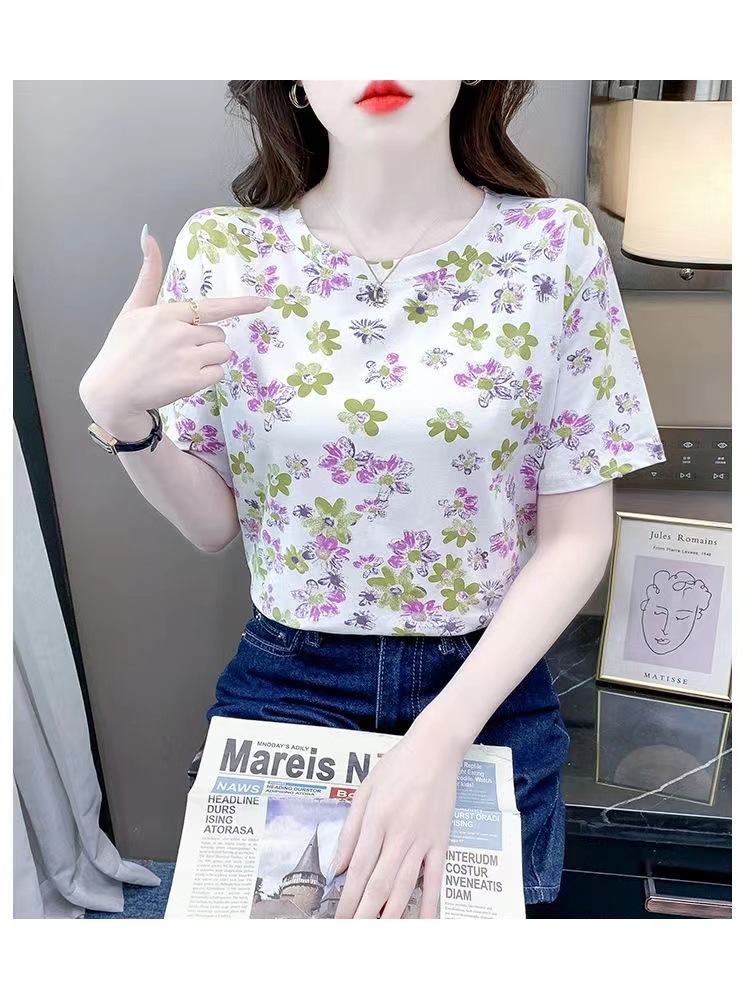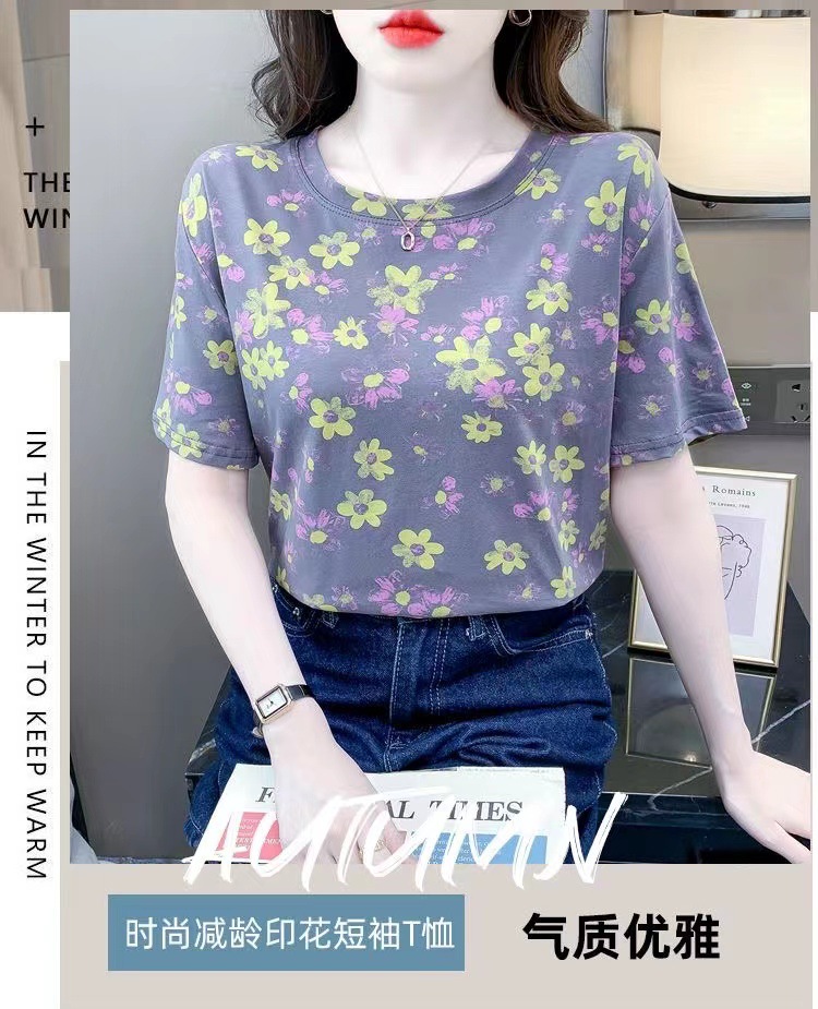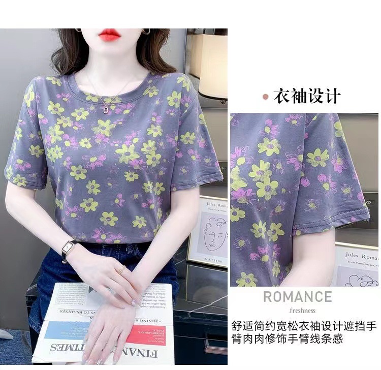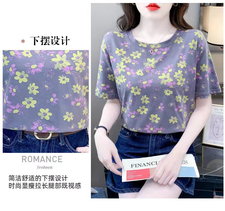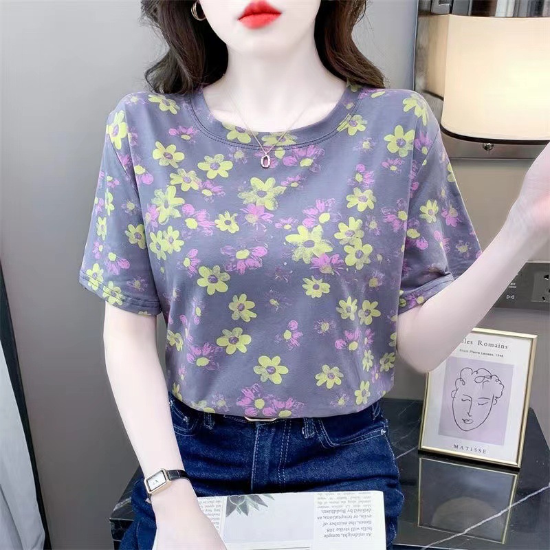 여성을위한 세련된 꽃 프린트 반팔 티셔츠 여름 새로운 느슨한 캐주얼 슬림 라운드 넥 티셔츠 탑스토어 가기