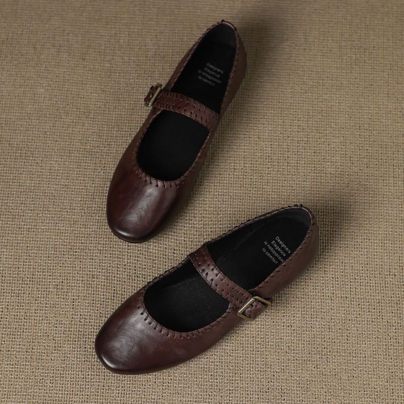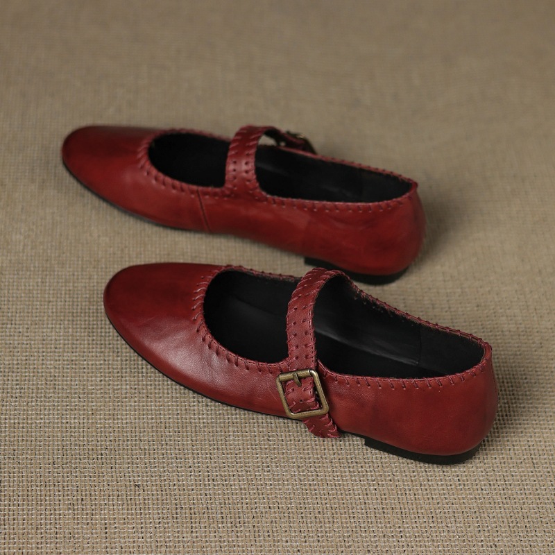 2025 신상 사계절 여성구두 소가죽 라운드 토 프렌치 복고풍 스타일 작은 가죽 신발 원라인 버클 스트랩 펌프스 플랫 슈즈스토어 가기