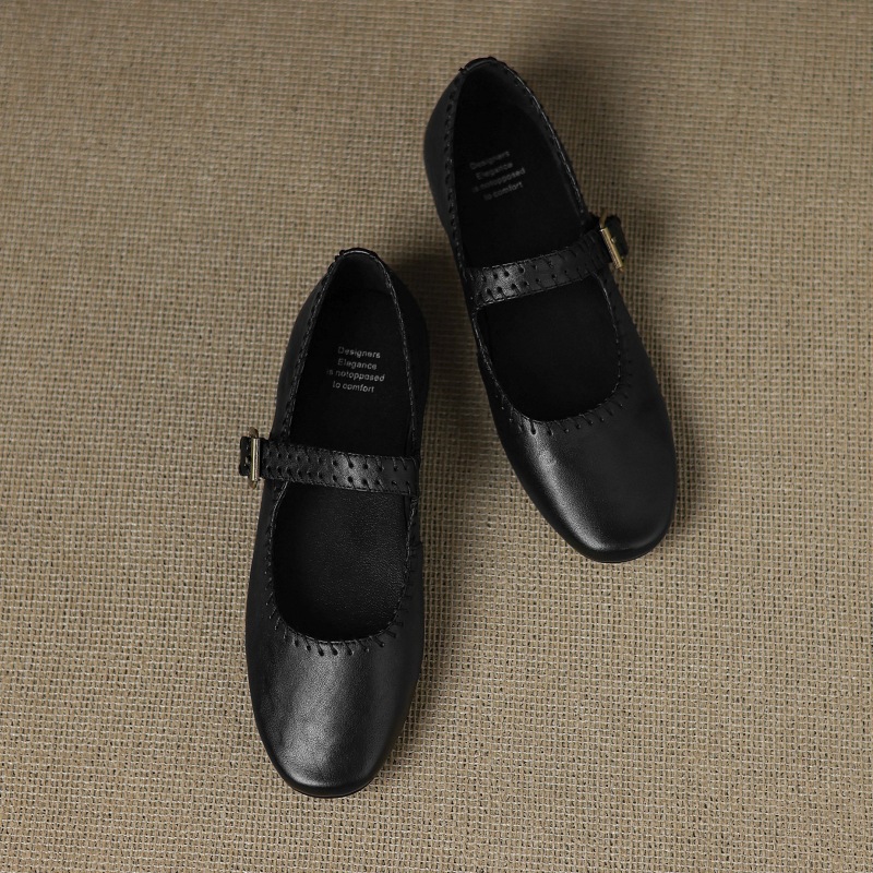 2025 신상 사계절 여성구두 소가죽 라운드 토 프렌치 복고풍 스타일 작은 가죽 신발 원라인 버클 스트랩 펌프스 플랫 슈즈