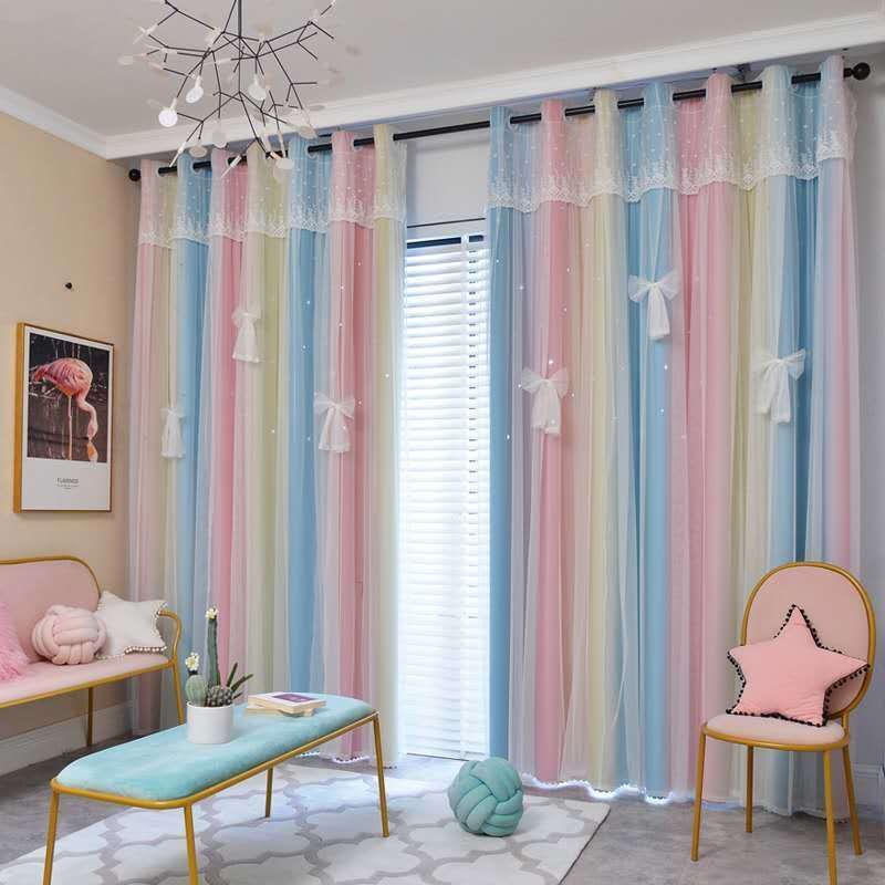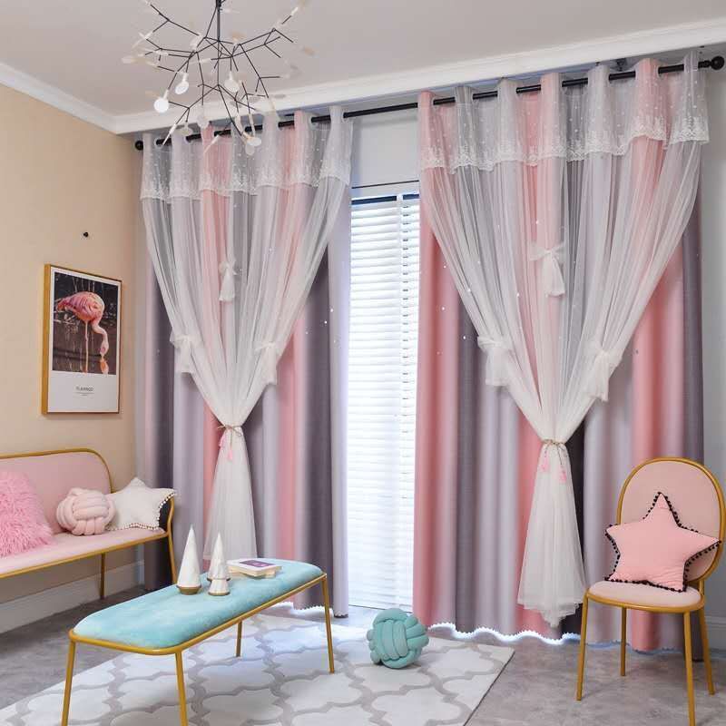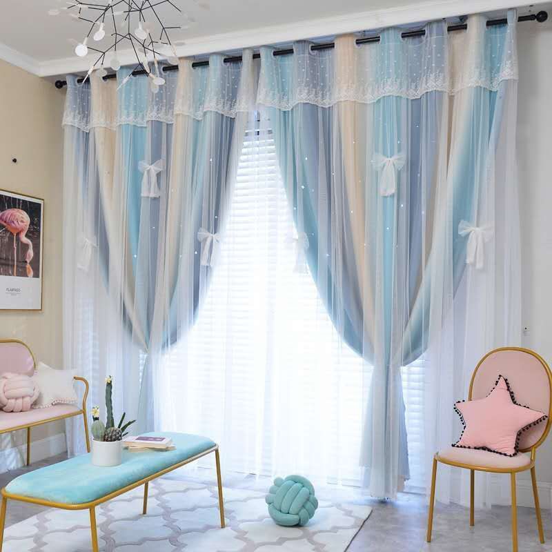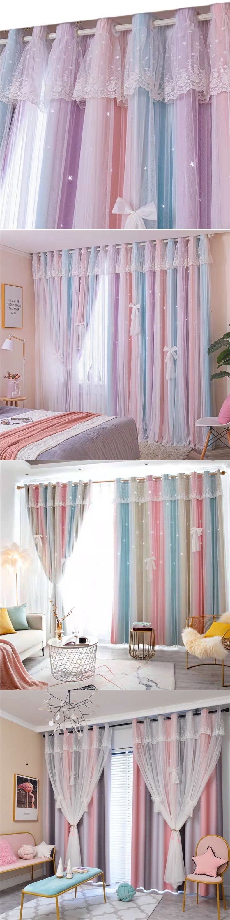 실이 있는 이중 레이어 차광 커튼, 공주풍 침실 별 커튼, 심플한 소녀 거실, 인터넷 연예인, 펀치 프리 플로팅