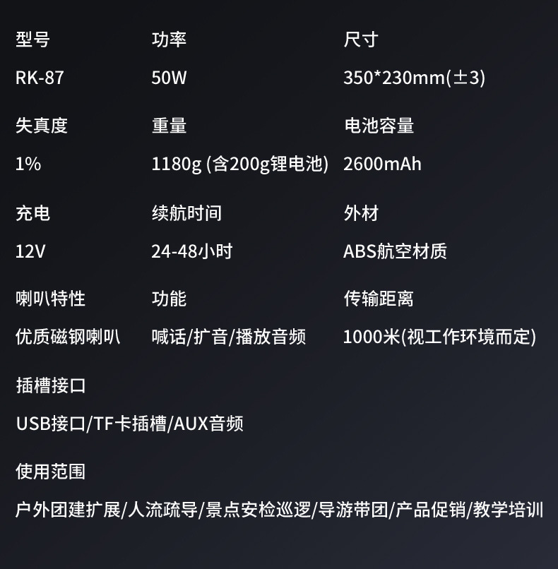 Thunder King RK-87 메가폰 50W 고출력 야외 프로모션 및 판매 Bluetooth 녹음 카드 확성기 스피커
