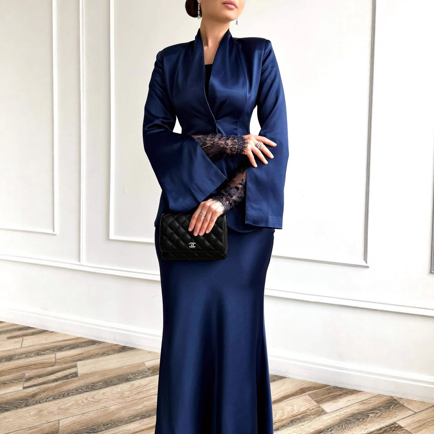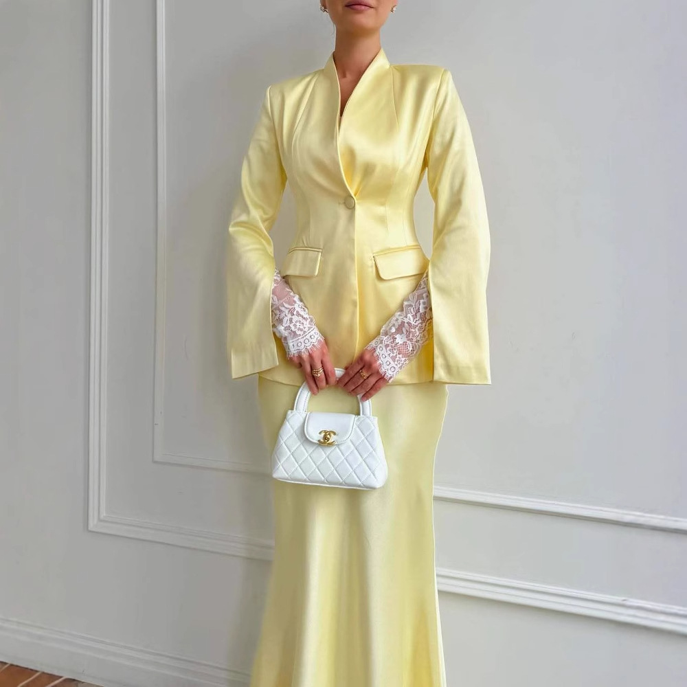 2025 가을 신상 유럽풍&미국풍 스타일의 다용도 슬릿 버튼 코트와 힙을 감싸는 새틴 스커트 세트 여성복