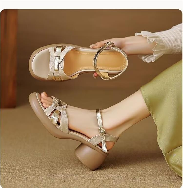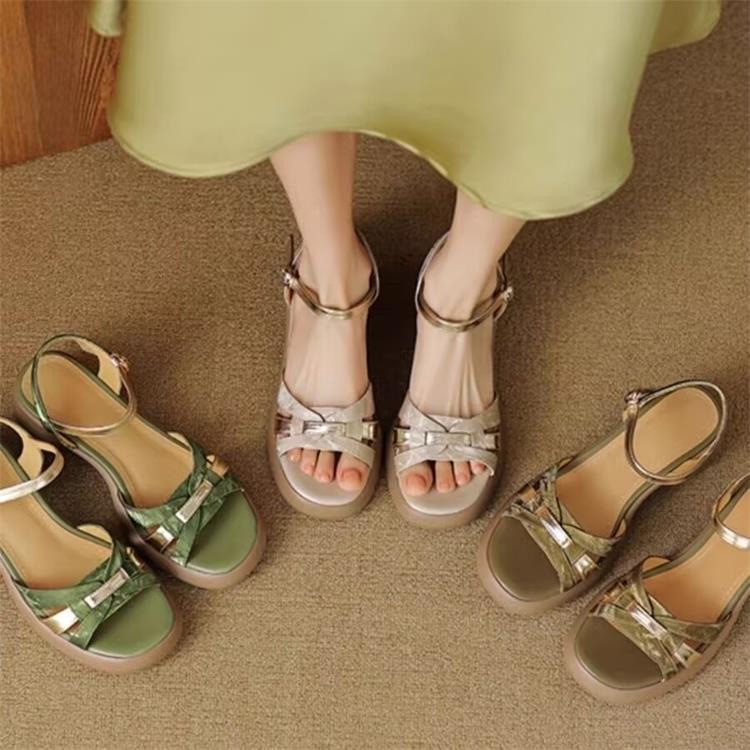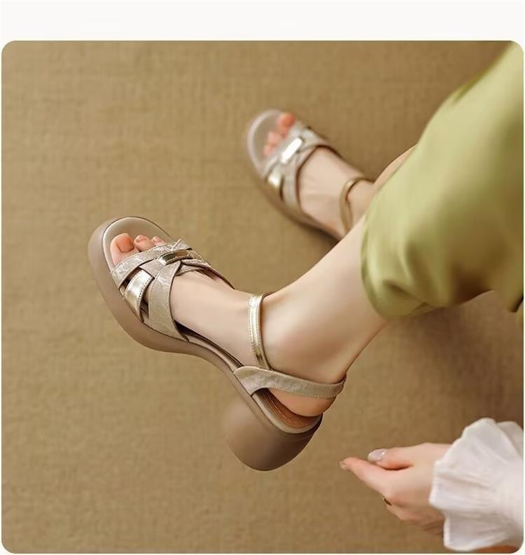 여성을위한 레트로 부드러운 가죽 두꺼운 밑창 하이힐 오픈 발가락 샌들 2025 여름 새로운 두꺼운 굽 짠 색상 일체형 로마 신발스토어 가기