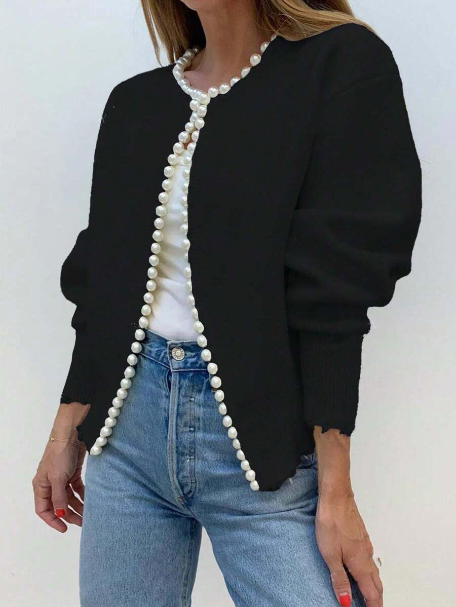 크로스보더 2025 봄 라운드 넥 진주 트림 스웨터 짧은 긴팔 헤비 카디건 스웨터 여성용 패션 재킷스토어 가기