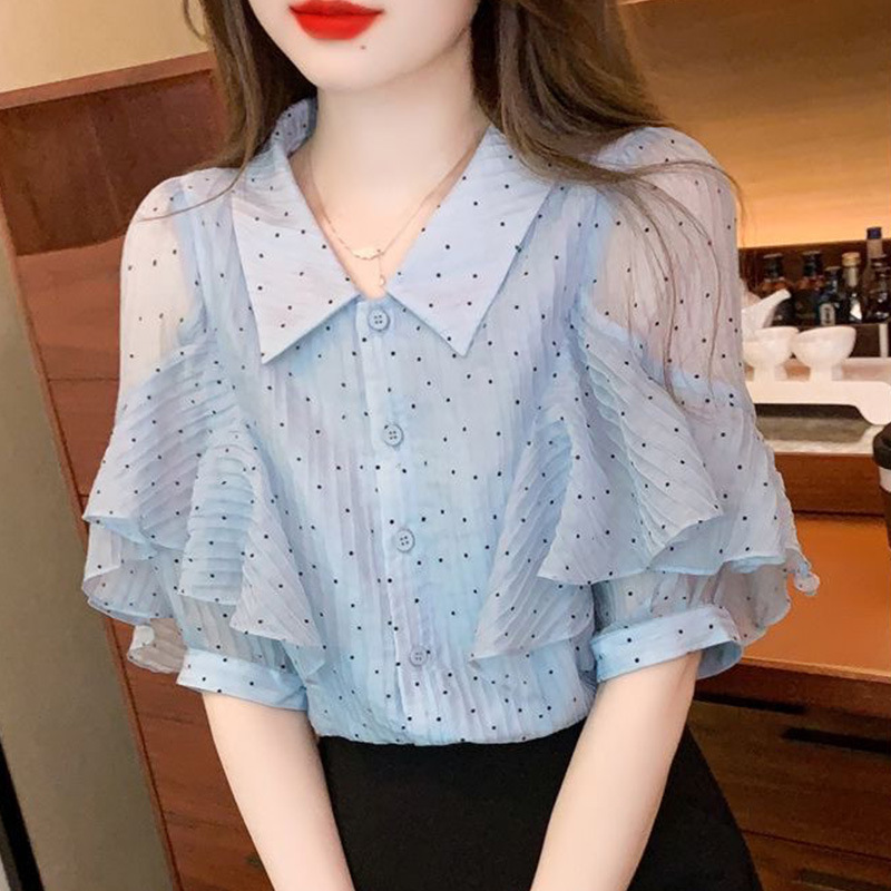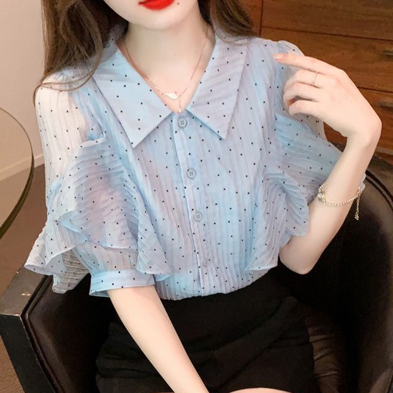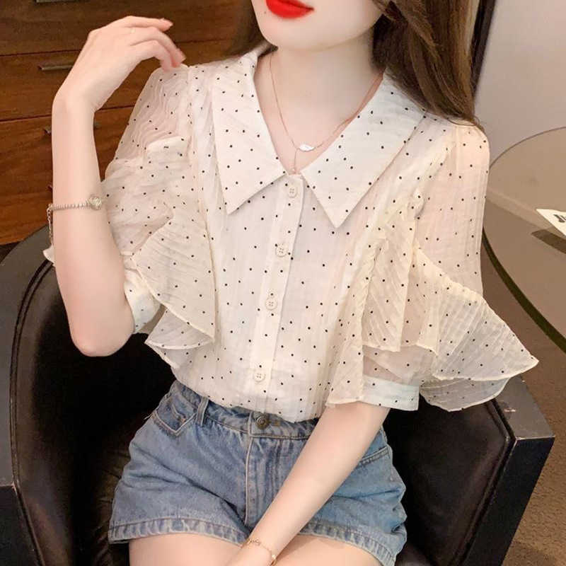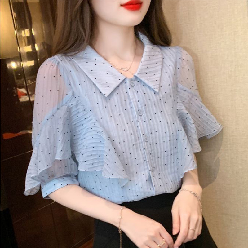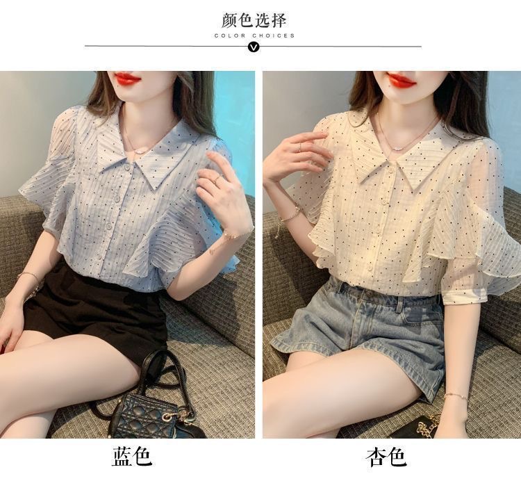 세련된 쉬폰 반팔 셔츠 여성 여름 착용 2025 여름 새로운 디자인 서양식 셔츠 슬리밍 탑스토어 가기