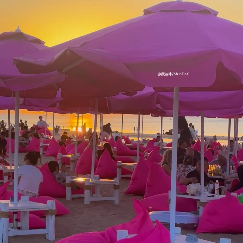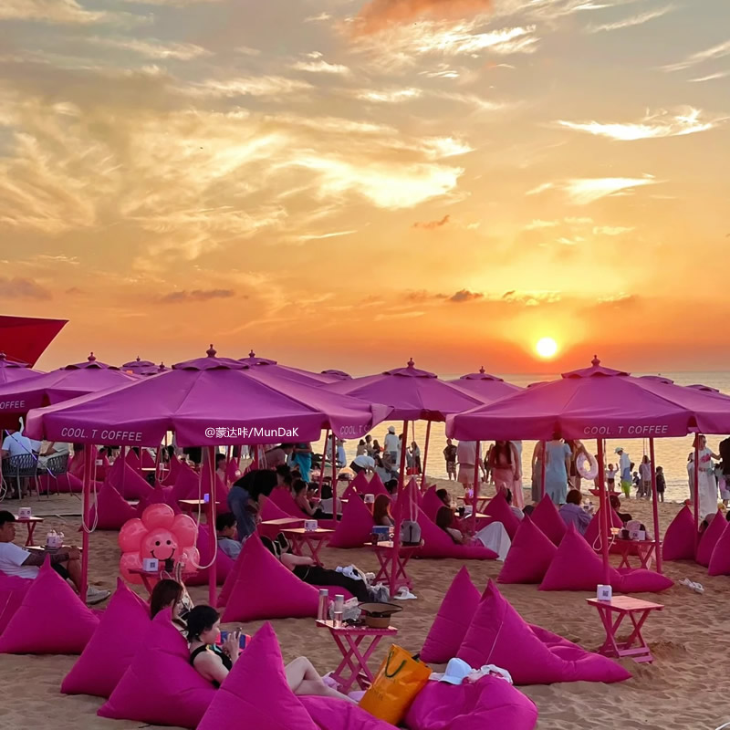 관광지 인터넷 연예인 로즈 레드 비치 캠프는 바비 핑크 파라솔, 비치 소파, 라운지 의자, 비치 테이블 및 의자 우산을 만듭니다.