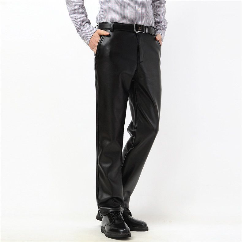남성용 가을 겨울 신축성 있는 허리 가죽 바지, 벨벳과 두꺼운 중년 및 노년층을 위한 하이 웨이스트 따뜻한 남성용 방수 및 방유 PU 가죽 바지스토어 가기