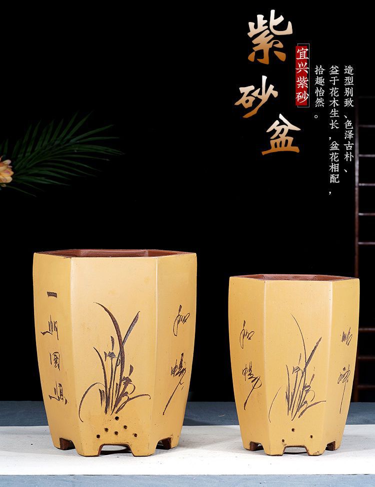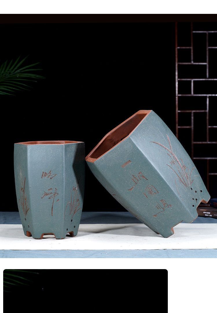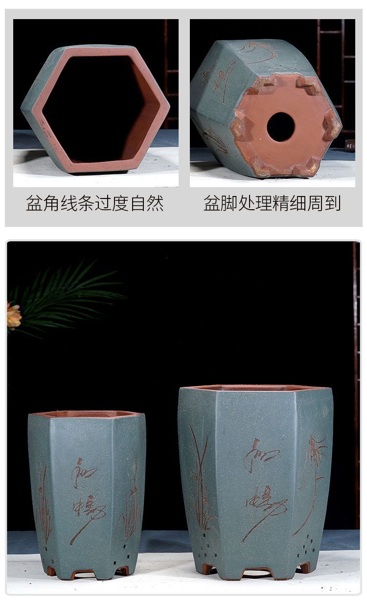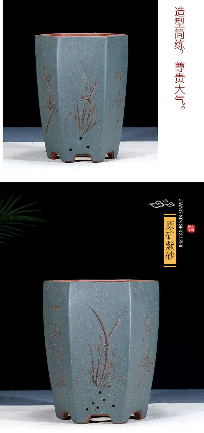 이싱 보라색 점토 화분, 육각형 난초 화분, 꽃과 녹색 식물 화분, 대형 수제 화분, 화분 Mingwei