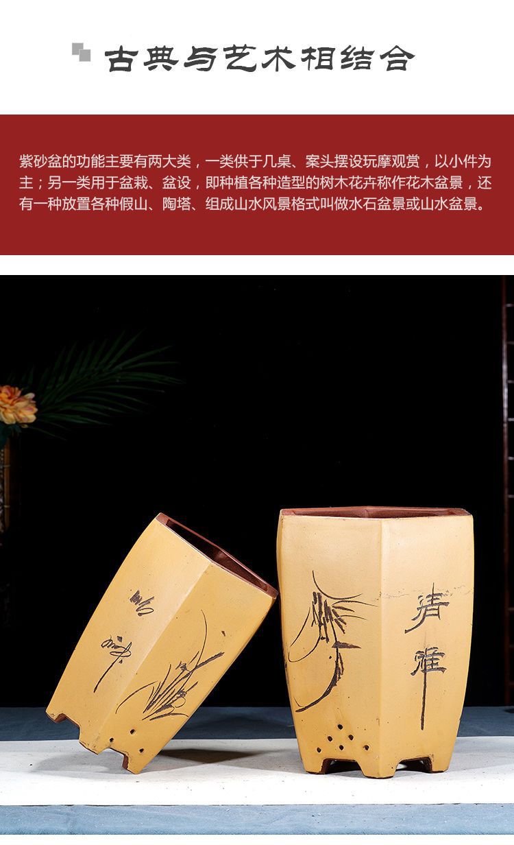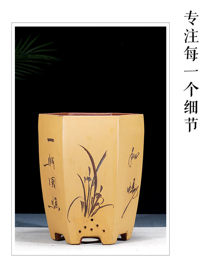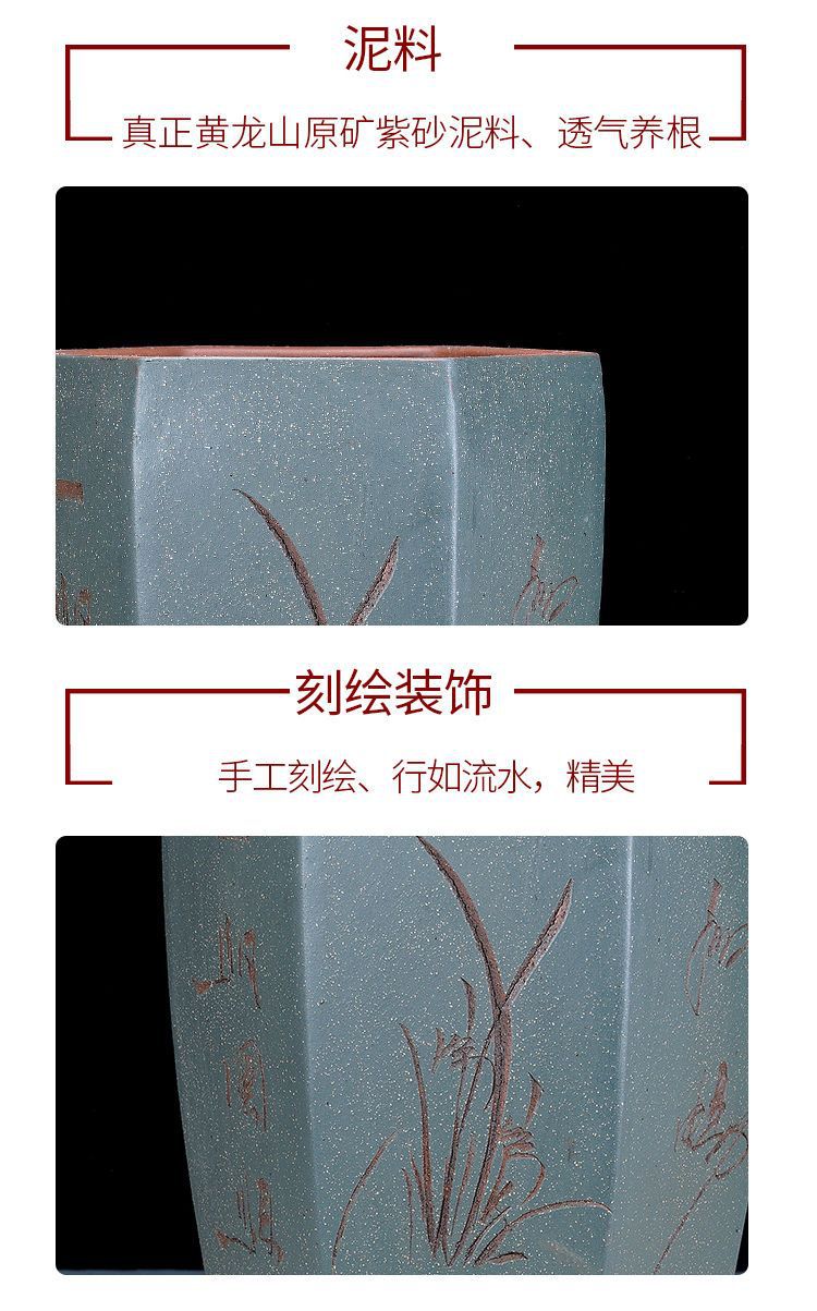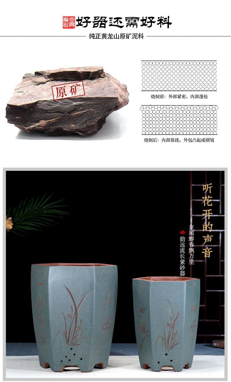 이싱 보라색 점토 화분, 육각형 난초 화분, 꽃과 녹색 식물 화분, 대형 수제 화분, 화분 Mingwei