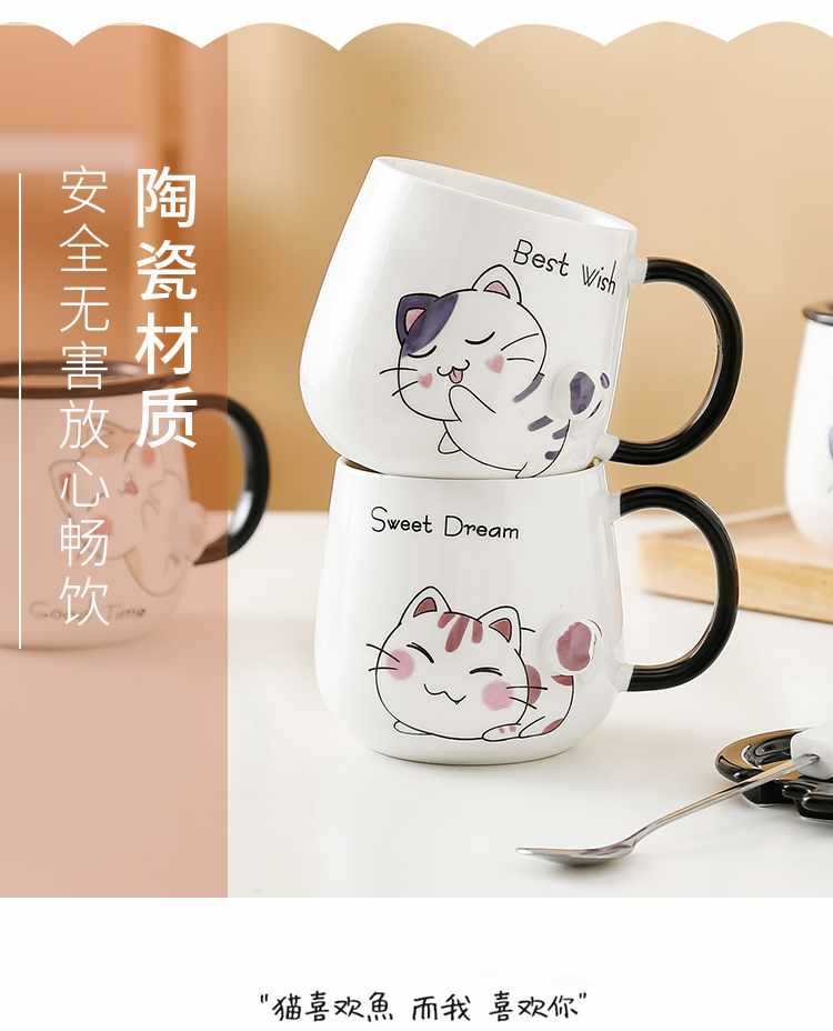 뚜껑이 있는 고양이 컵 마크, 스푼, 세라믹 물컵, 세라믹 만화 남성과 여성 커플 컵, 사무실 커피 아침 식사 컵