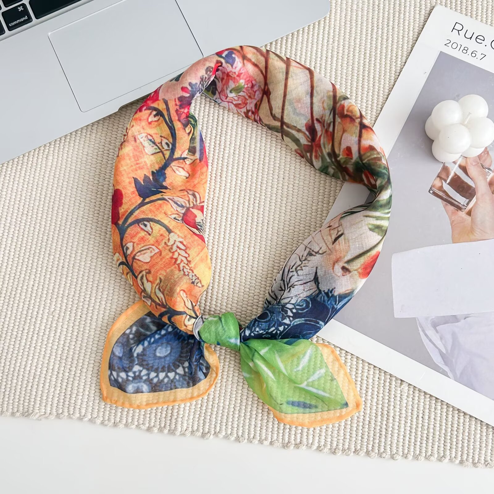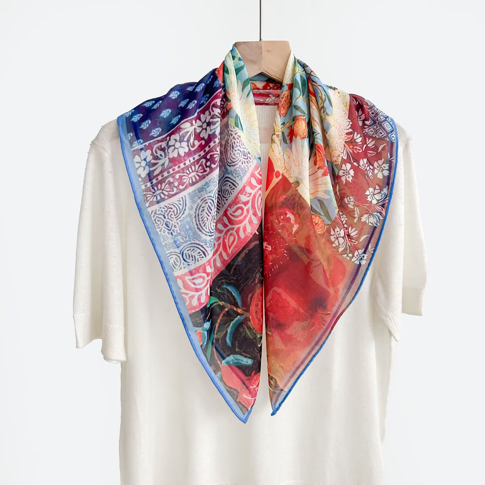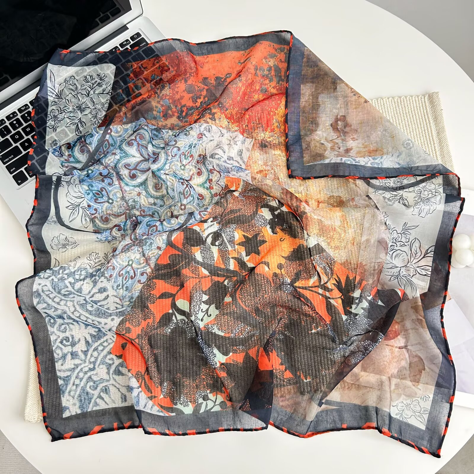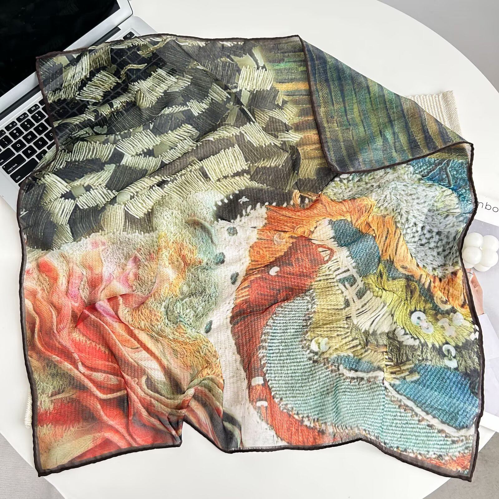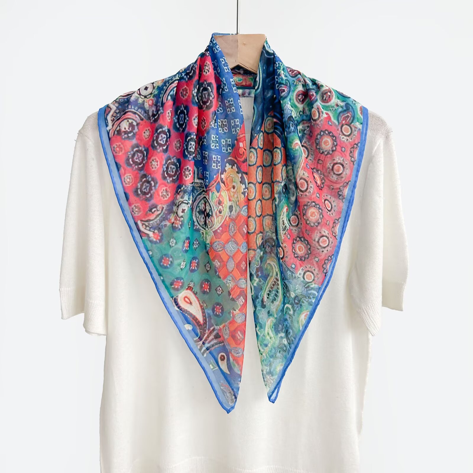 70개의 사각 스카프, 실크 면 느낌, 고화질 프린트 실크 스카프, 여성 민족 스타일 복고풍 유화 얇은 스카프, 다용도 스카프