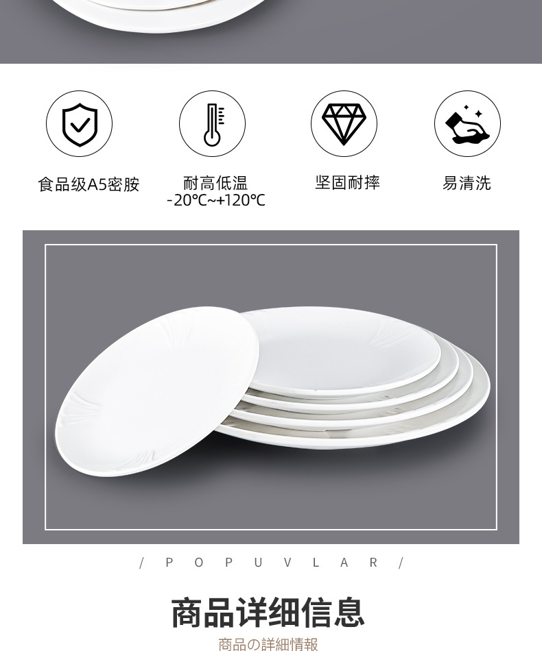 멜라민 흰색 원형 플라스틱 접시 모조 도자기 레스토랑 호텔 디너 접시 호텔 식기 전골 접시 차가운 요리 접시 상업용스토어 가기