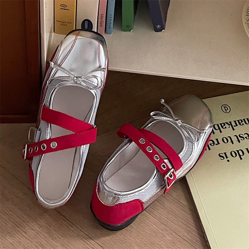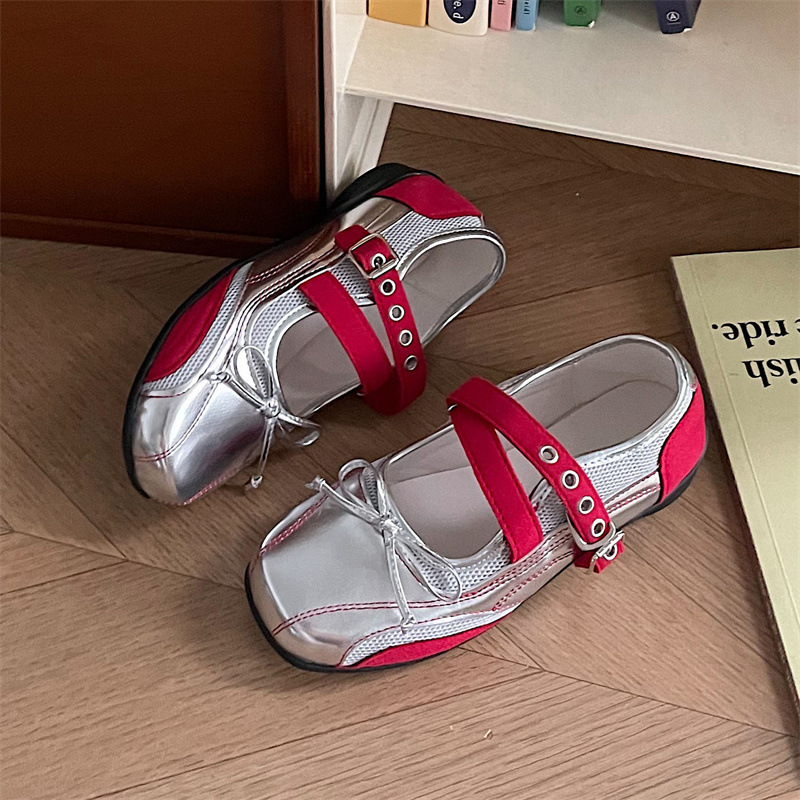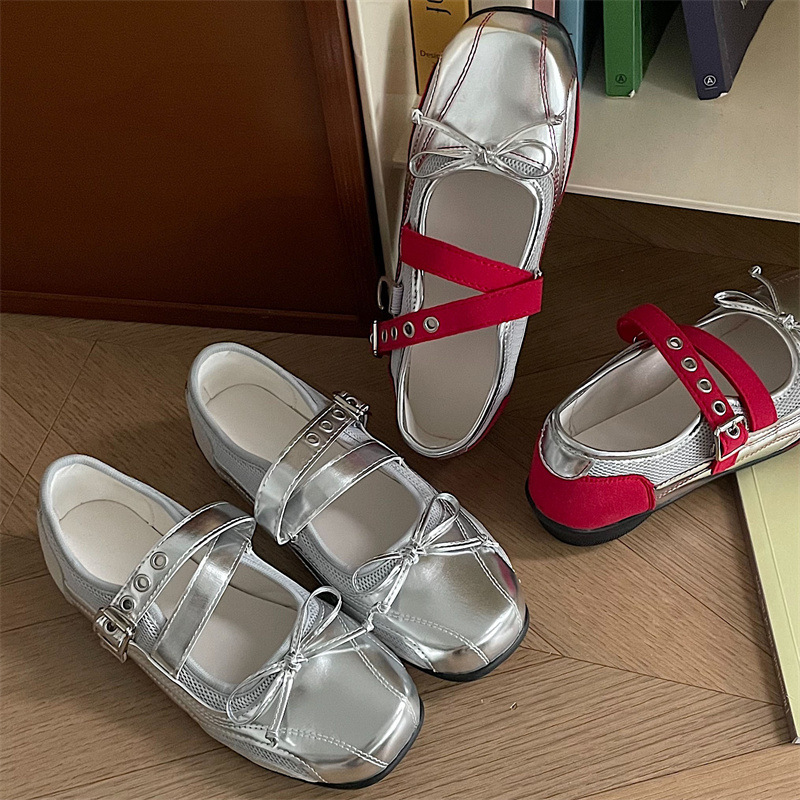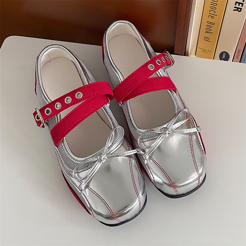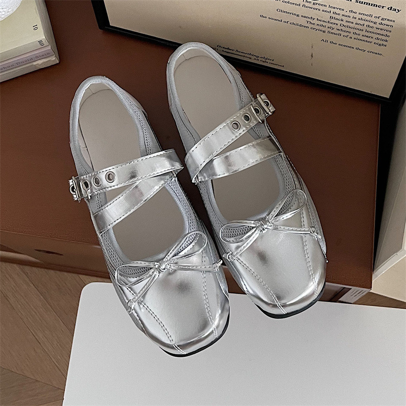 여성을위한 실버 하이 엔드 프렌치 스퀘어 토 플랫 슈즈 2025 여름 새로운 스타일 스커트 소프트 솔 메리 제인 슈즈
