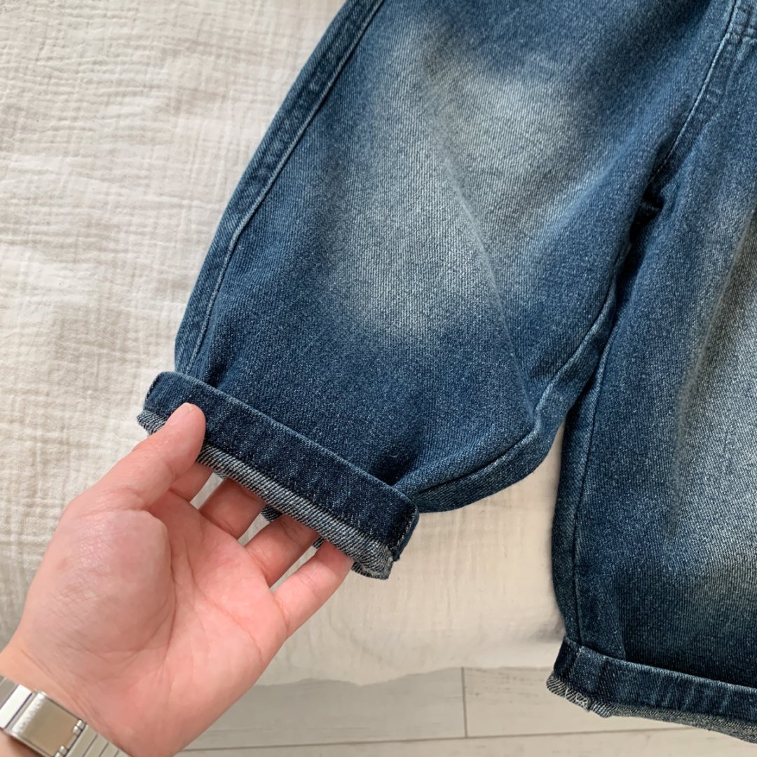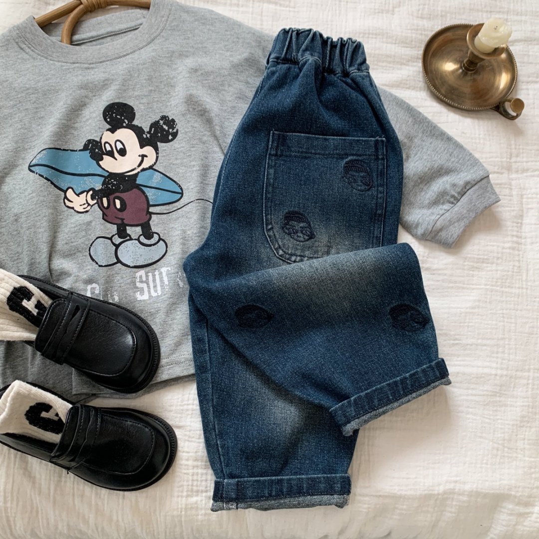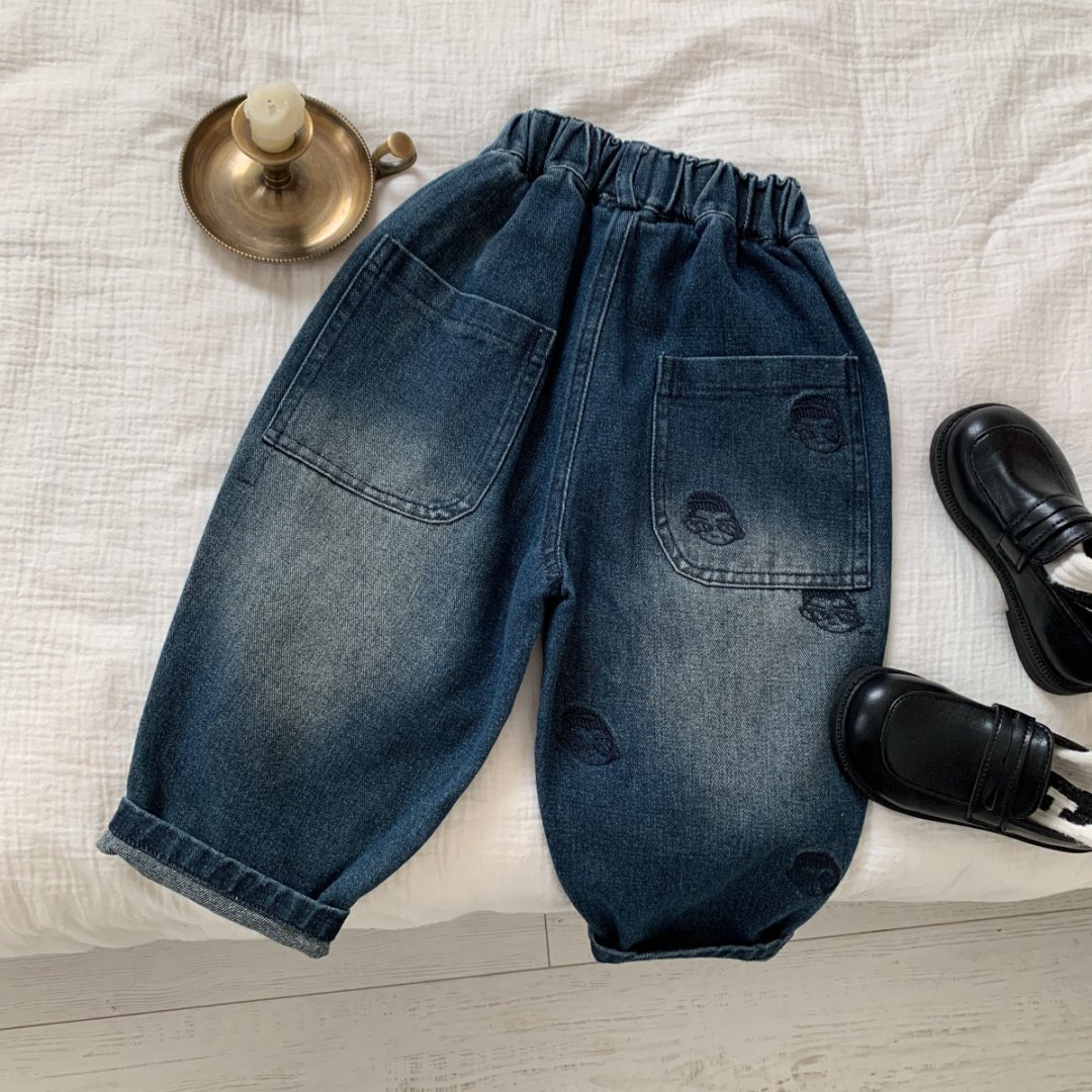 아동 청바지 2025 가을 새로운 아동복 소년과 소녀 유행 멋진 인쇄 샌드 워시 스프레이 화이트 캐주얼 바지스토어 가기