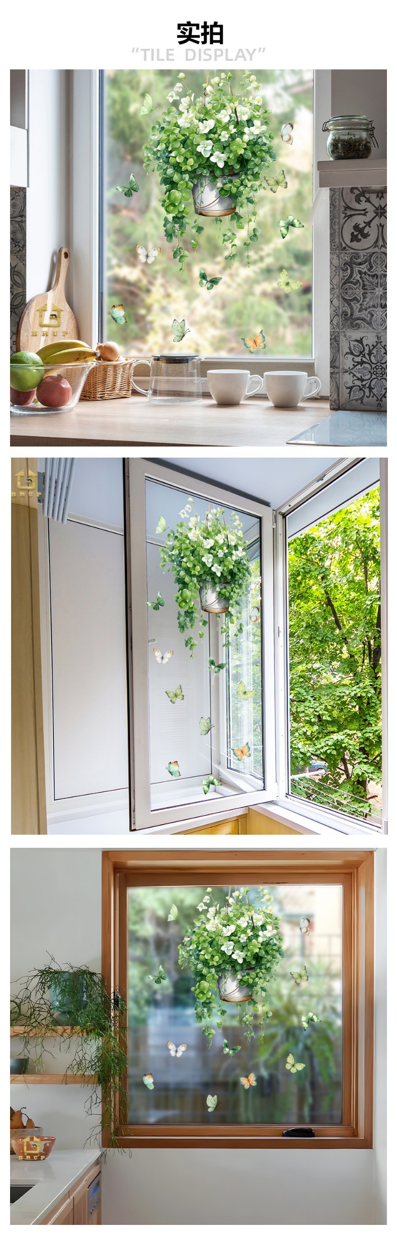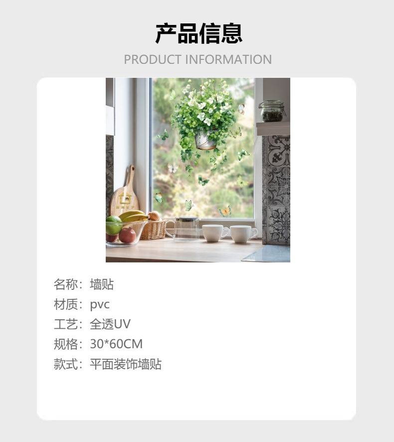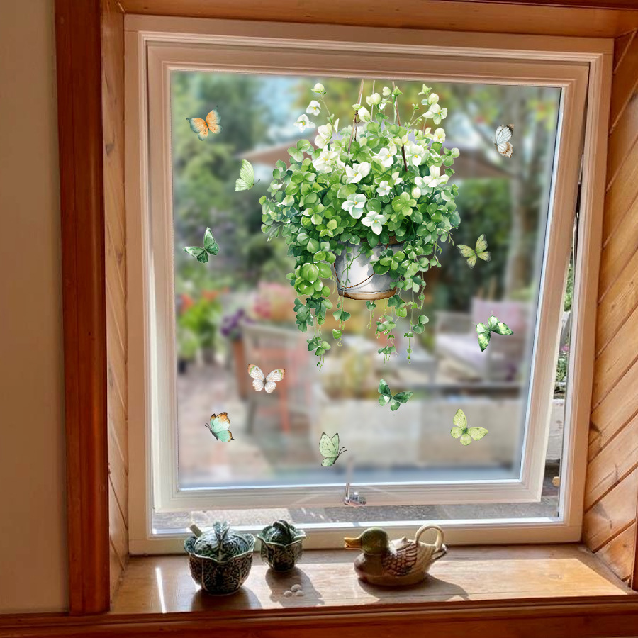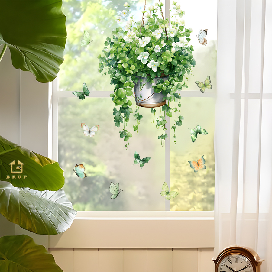 BR-UV4017E 작은 신선한 돈 문자열 등나무 녹색 식물 화분 나비 자체 접착 창 스티커 양면 시각적 장식 스티커