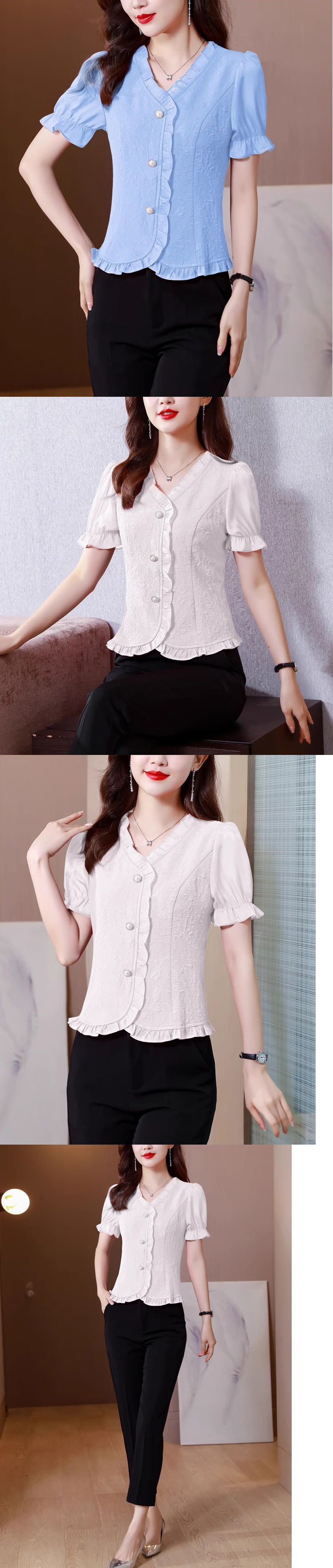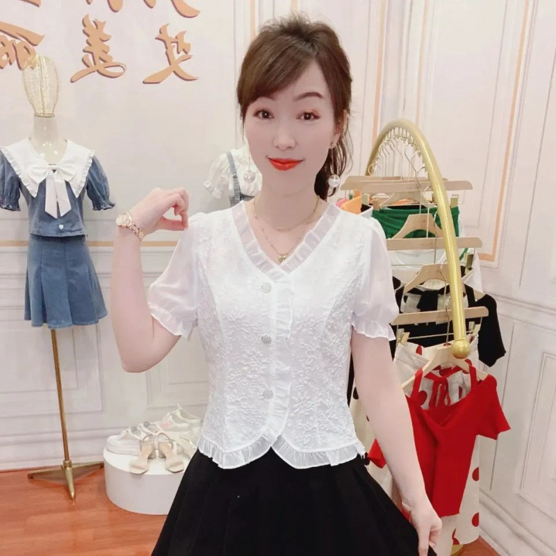 여성을위한 프렌치 브이넥 퍼프 슬리브 쉬폰 셔츠 2024 봄 새로운 디자인 다용도 반팔 셔츠스토어 가기