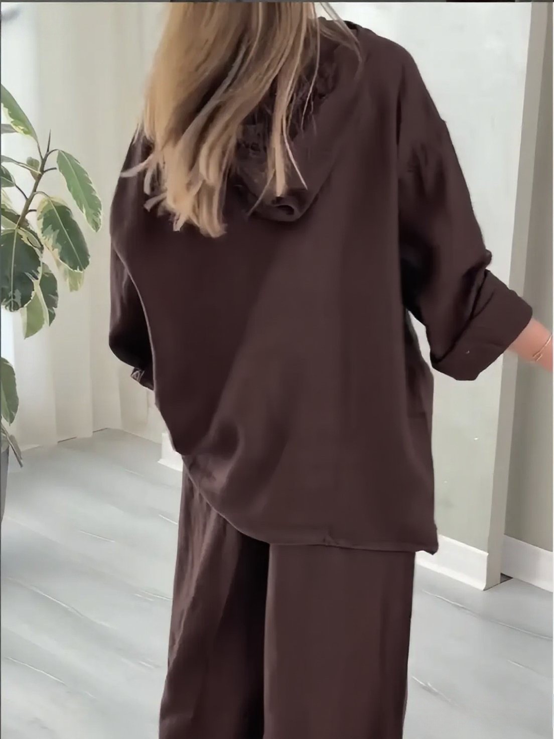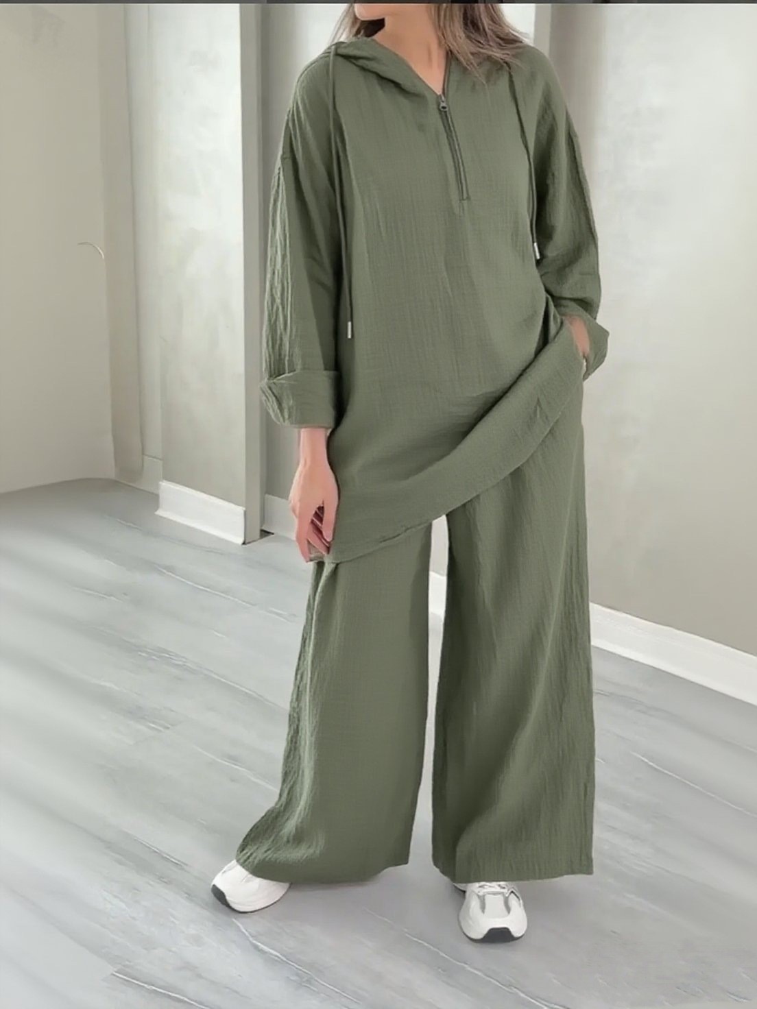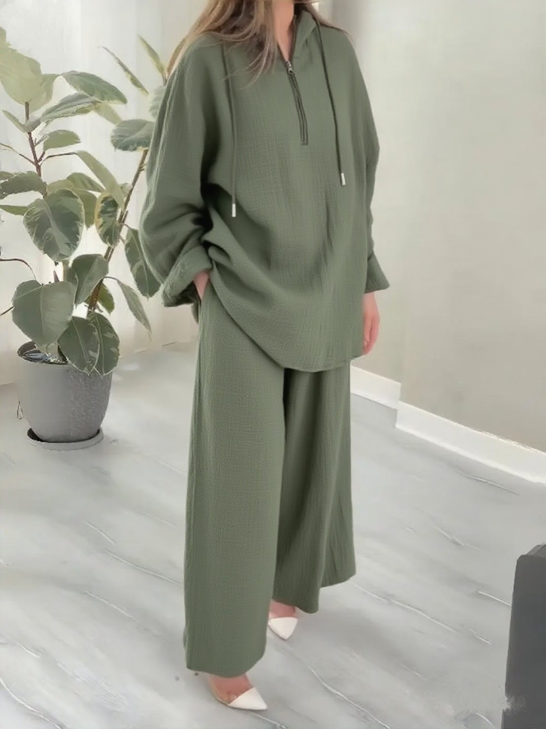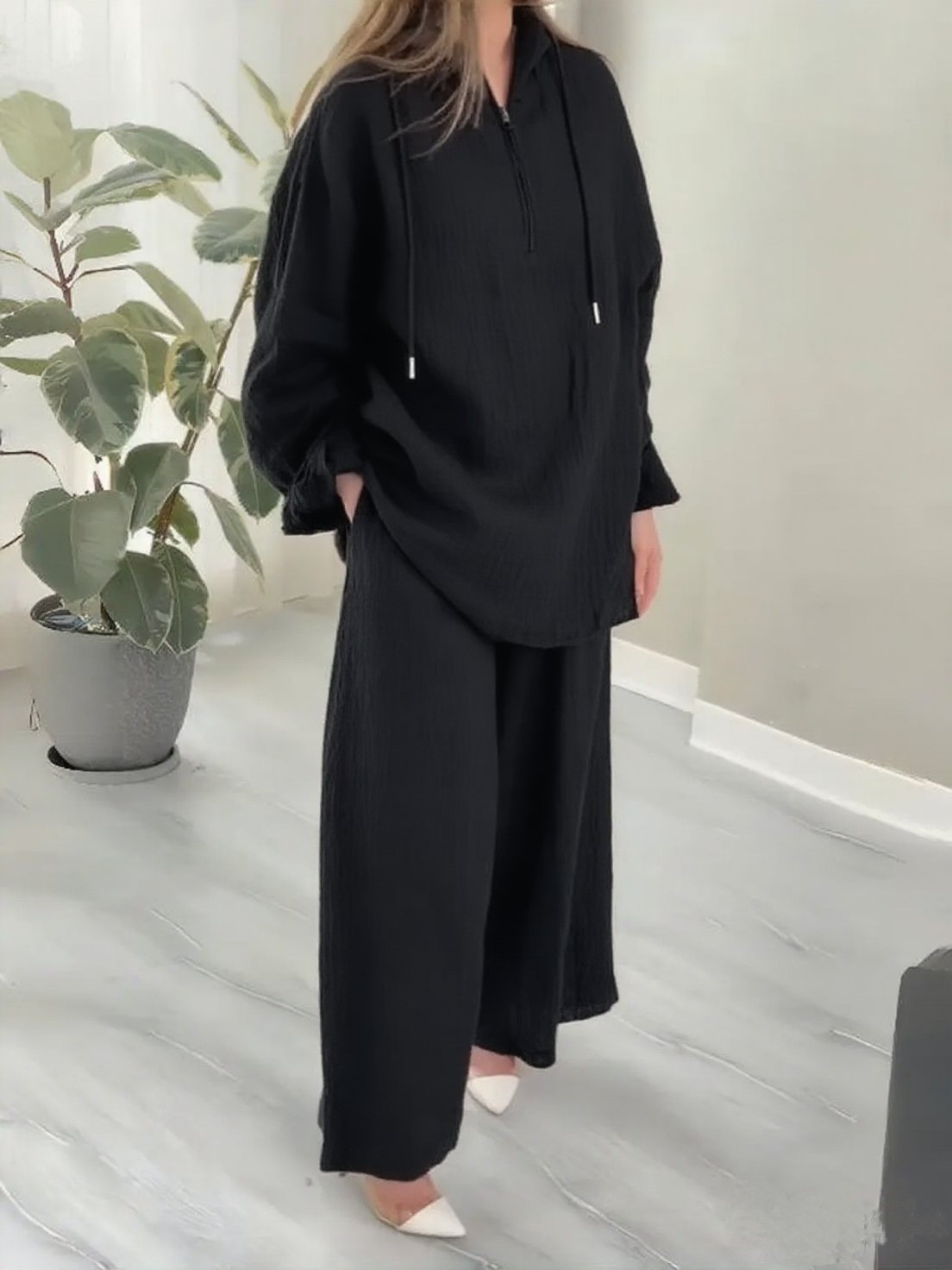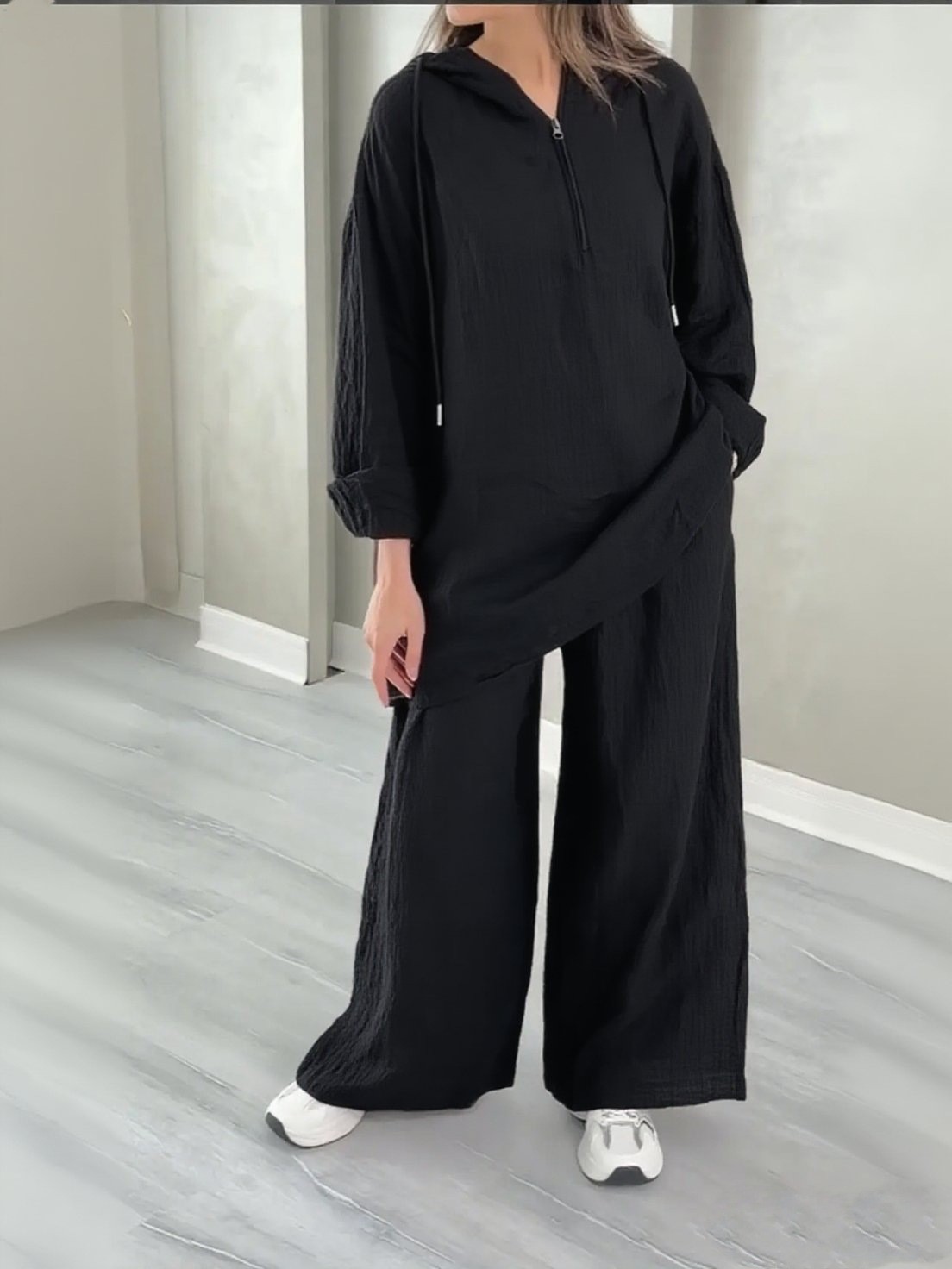 2025 유럽과 미국의 크로스보더 핫 스타일 게으른 스타일 후드 하프 지퍼 탑 와이드 레그 팬츠 슈트 루즈한 대형 2피스 세트
