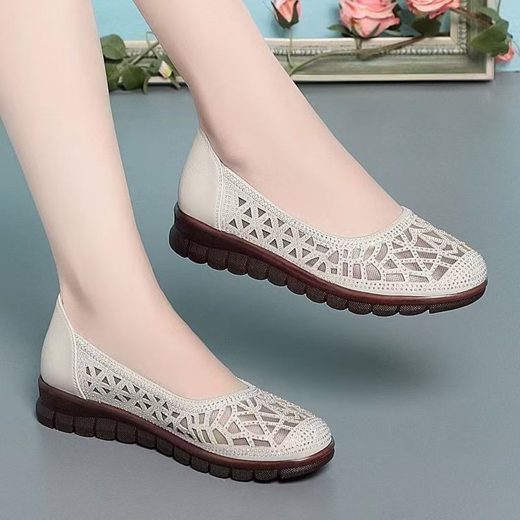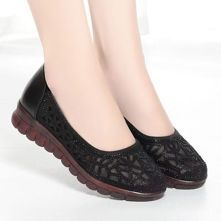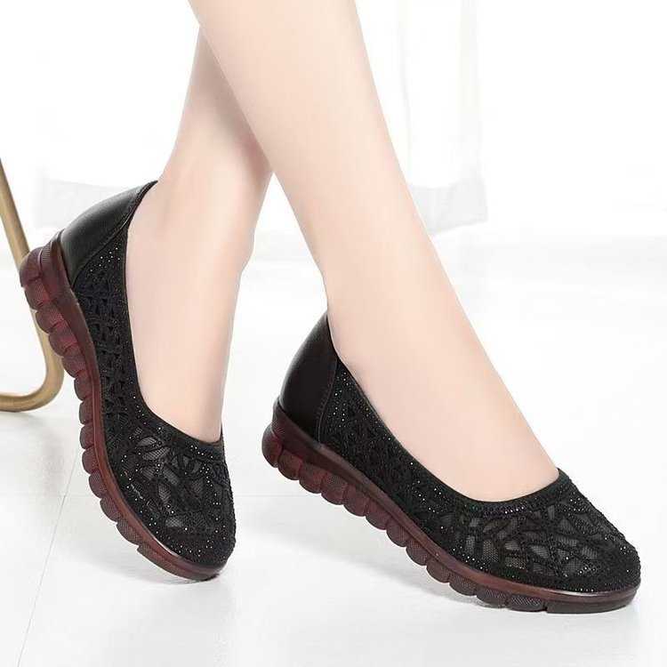 여름 여성 신발 부드러운 밑창 중공 메쉬 신발 2025 새로운 중년 및 노인 샌들 플랫 대형 어머니의 힘줄 밑창