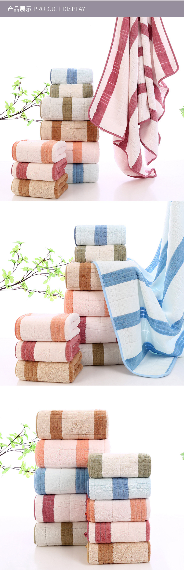공장 도매 속건성 선물 산호 벨벳 목욕 타월 부드럽고 두꺼운 흡수성 넓은 줄무늬 영국 스타일 엣지 비치 타월