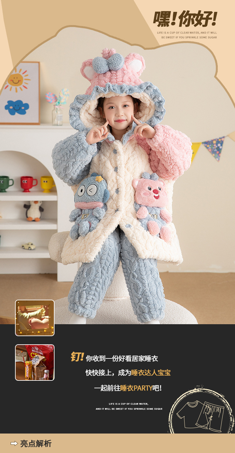 여아 잠옷 겨울 새로운 스타일 3겹 누비 이불 두꺼운 벨벳 따뜻한 큰 어린이 산호 벨벳 만화 달콤하고 귀여운스토어 가기