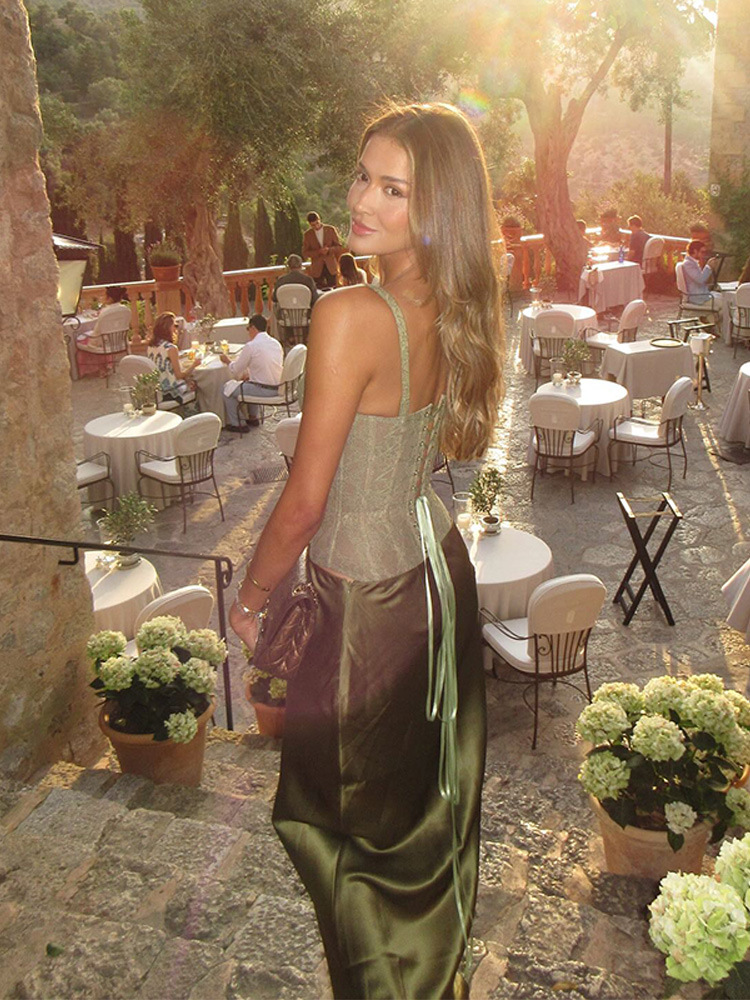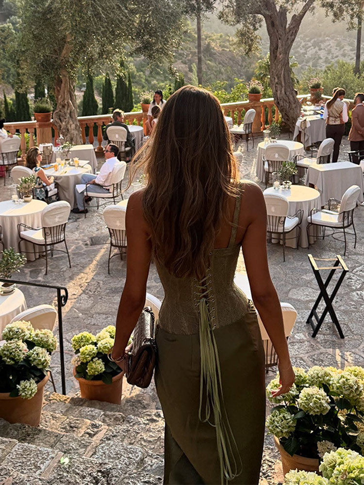 유럽과 미국의 국경 간 2025 새로운 여름 여성 섹시한 레이스 서스펜더 타이트 탑 스커트 롱 스커트 슈트스토어 가기