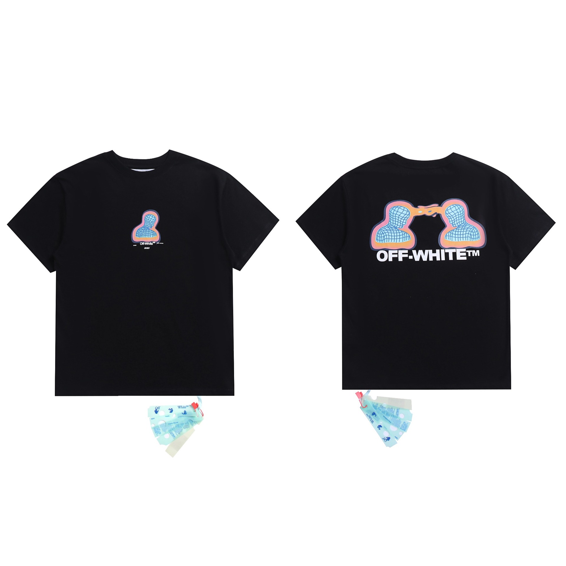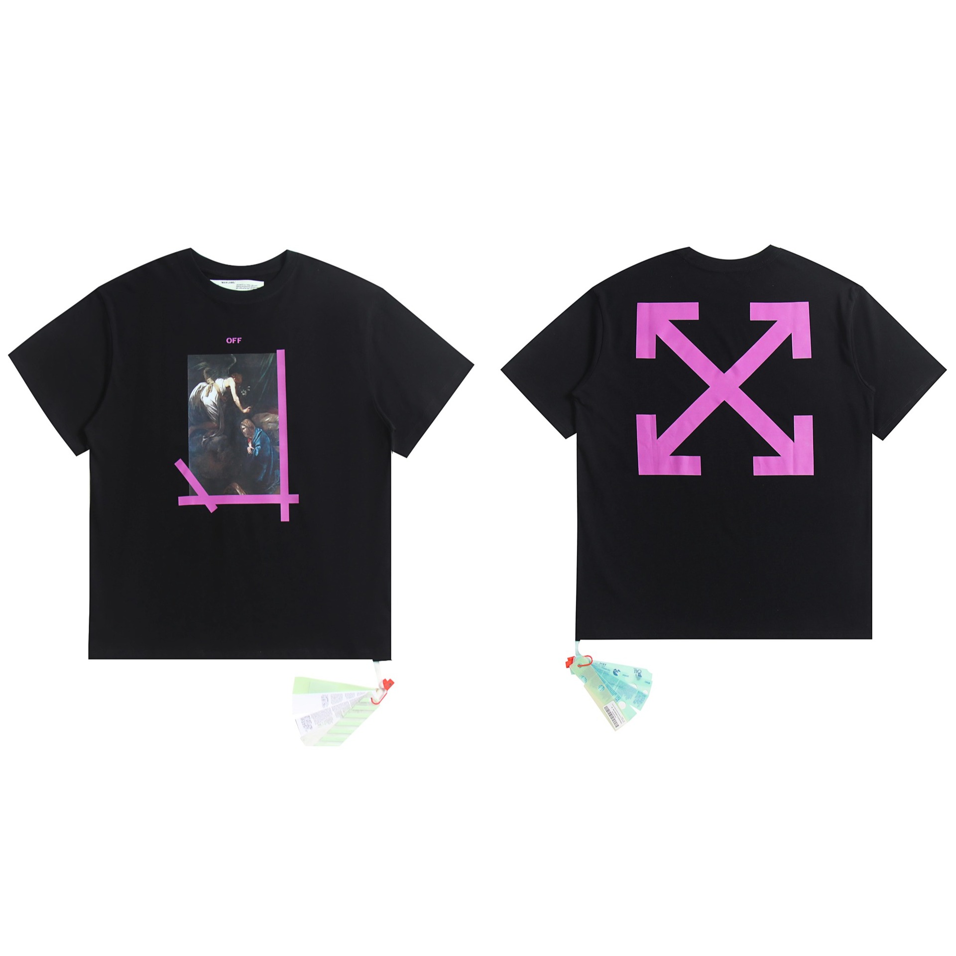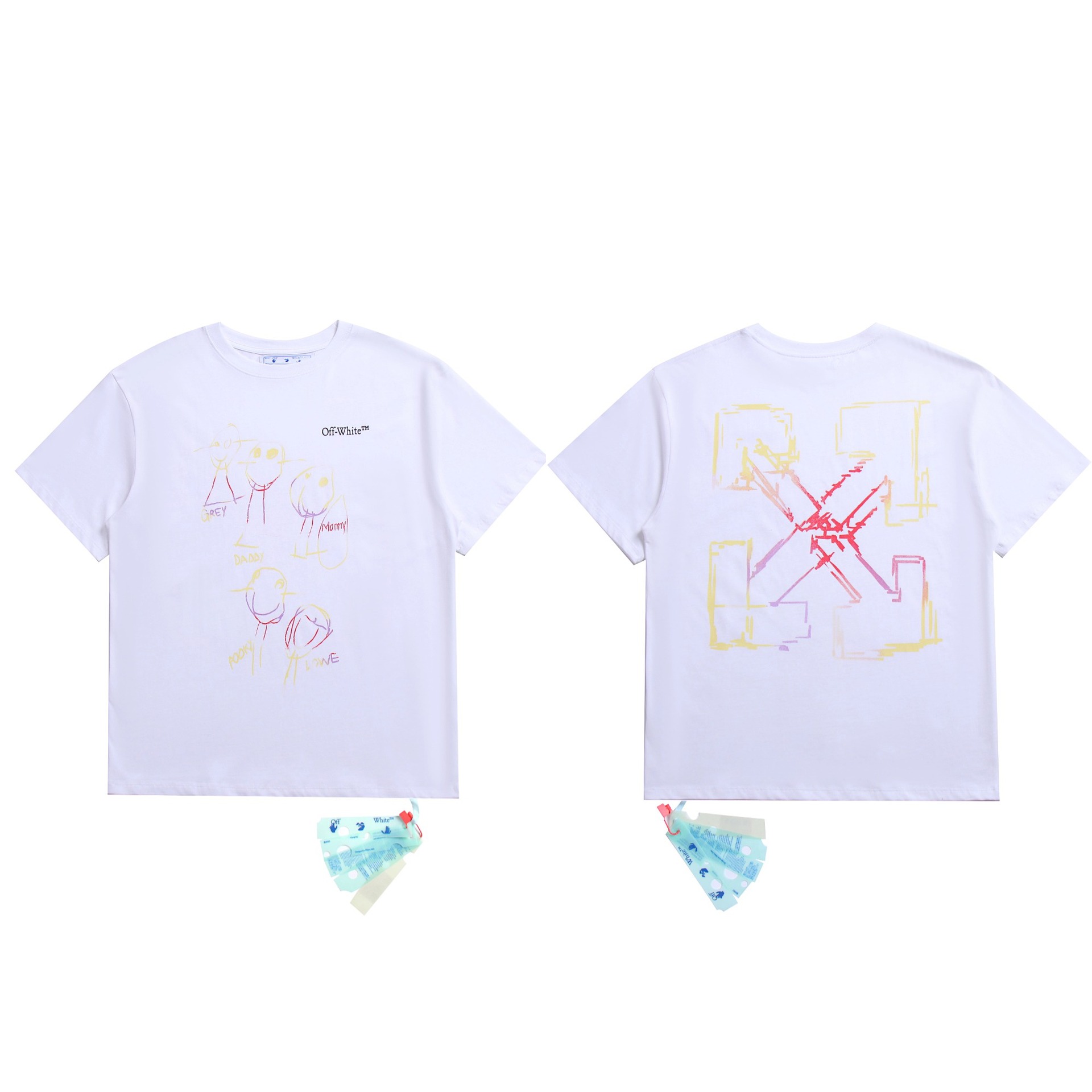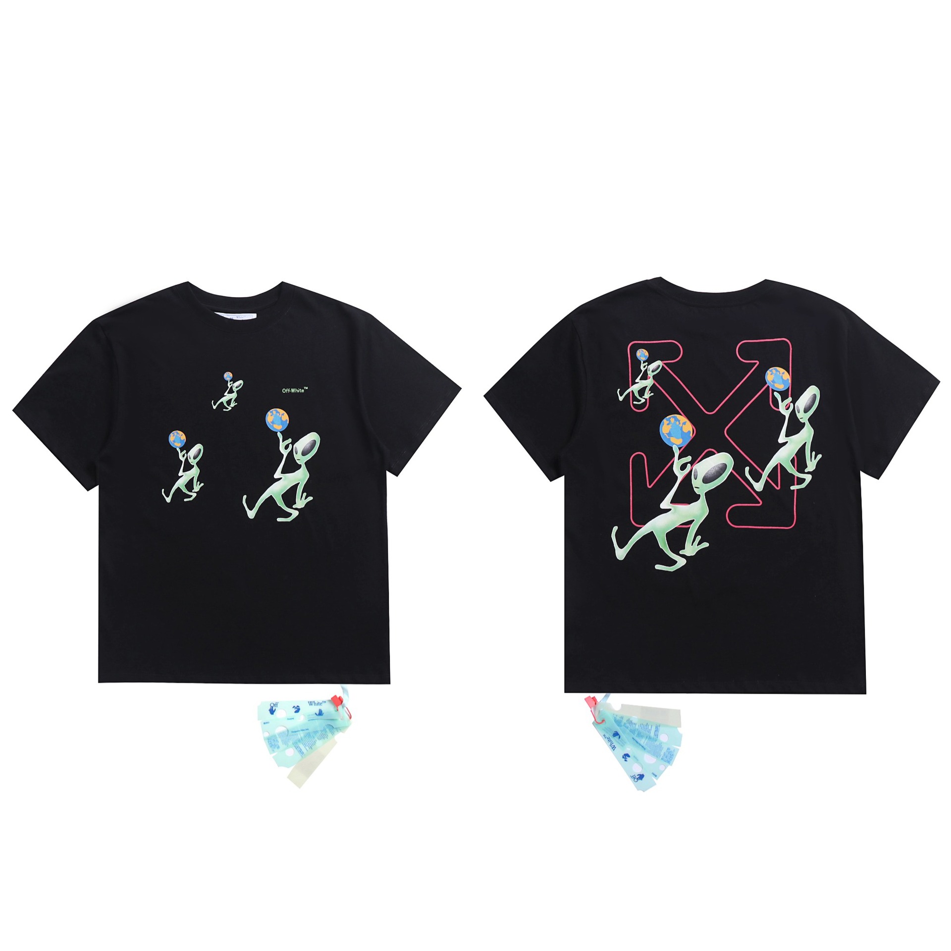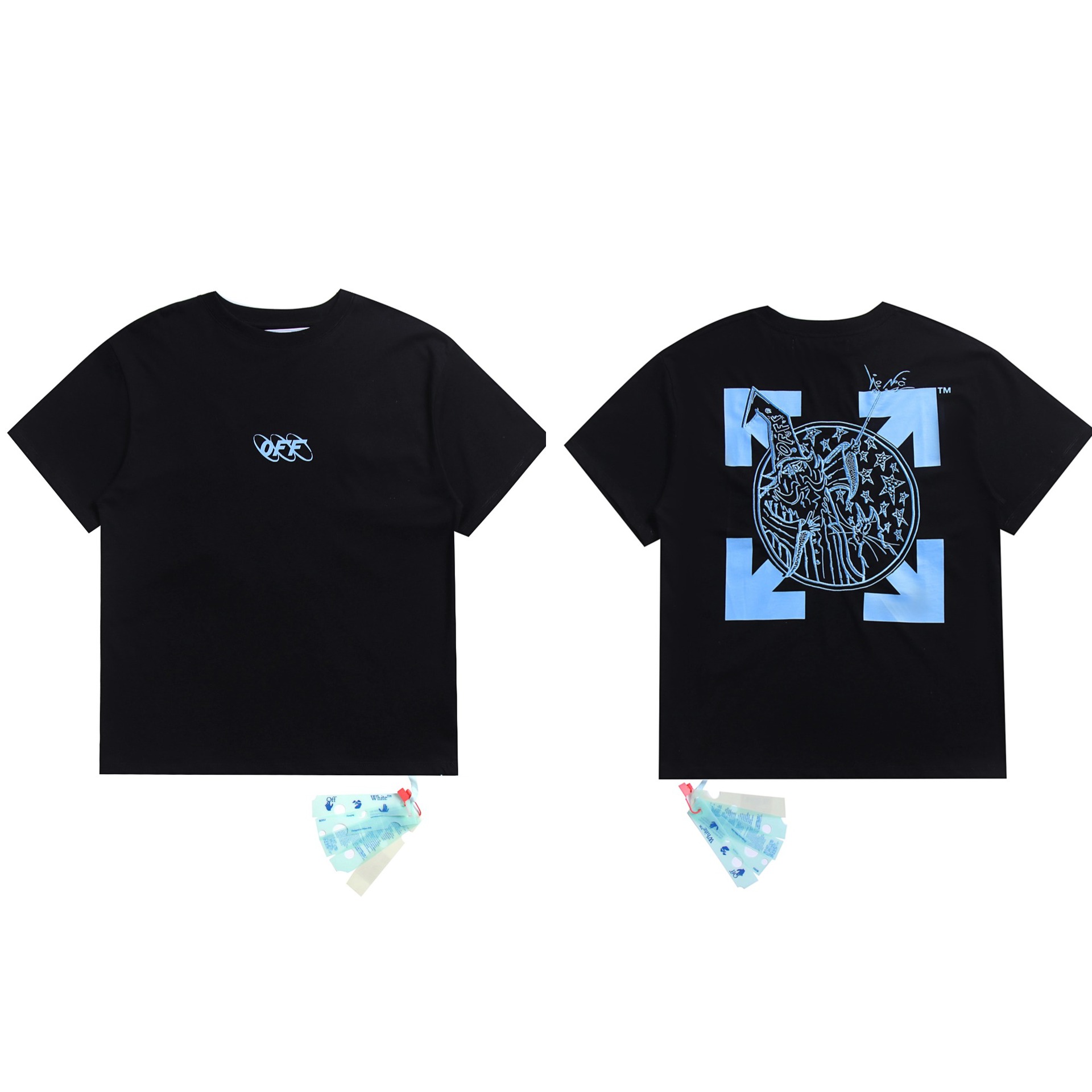 고품질 OW 자수 달 모양 배색 화살표 패턴 라운드넥 풀오버 반팔 남녀공용 라지 사이즈