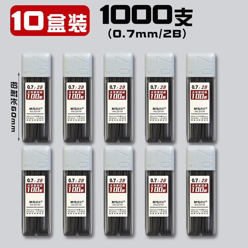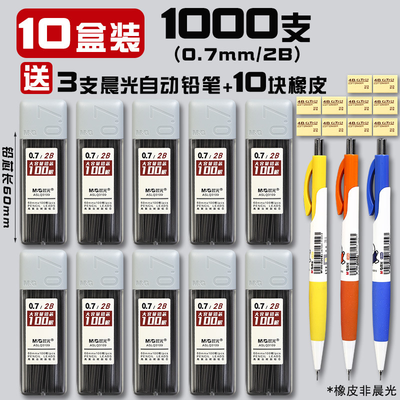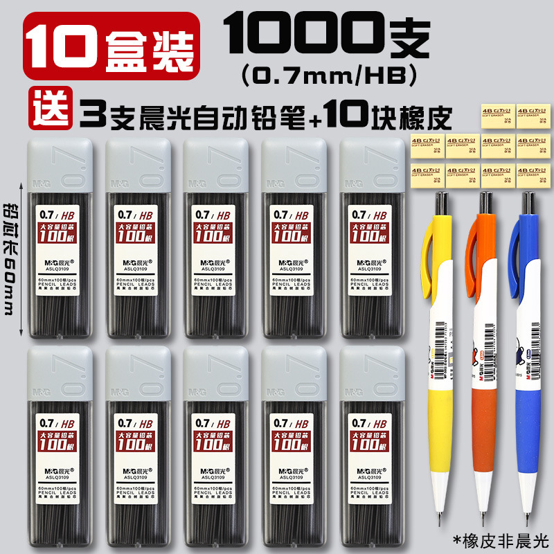 • 0.7/HB(1000개) 10박스에 모닝라이트 자동연필 3개 + 지우개 10개가 들어있습니다.