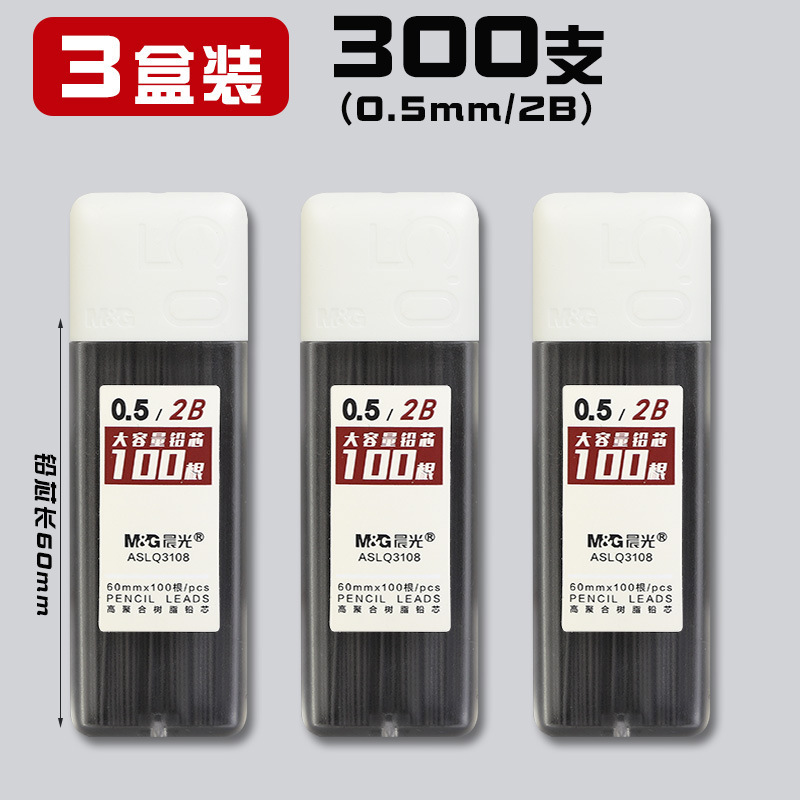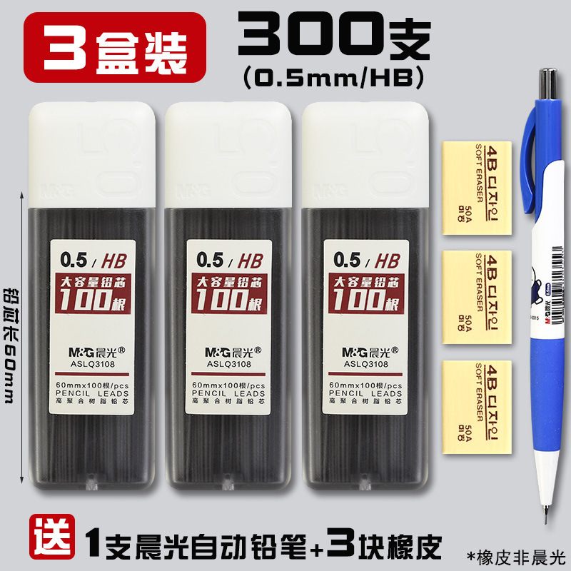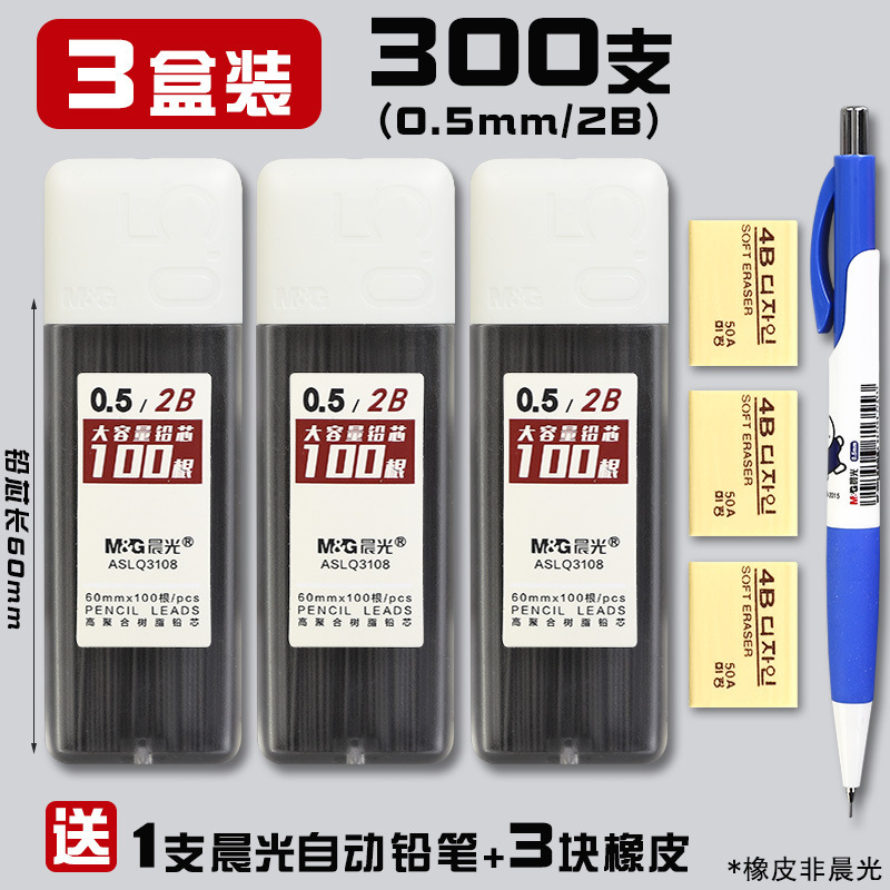 • 0.5/2B(300개) 3박스에 모닝라이트 자동연필 + 지우개 3개가 들어있습니다.