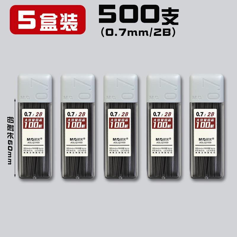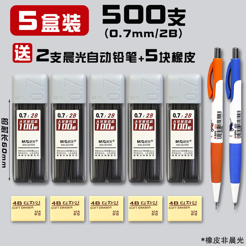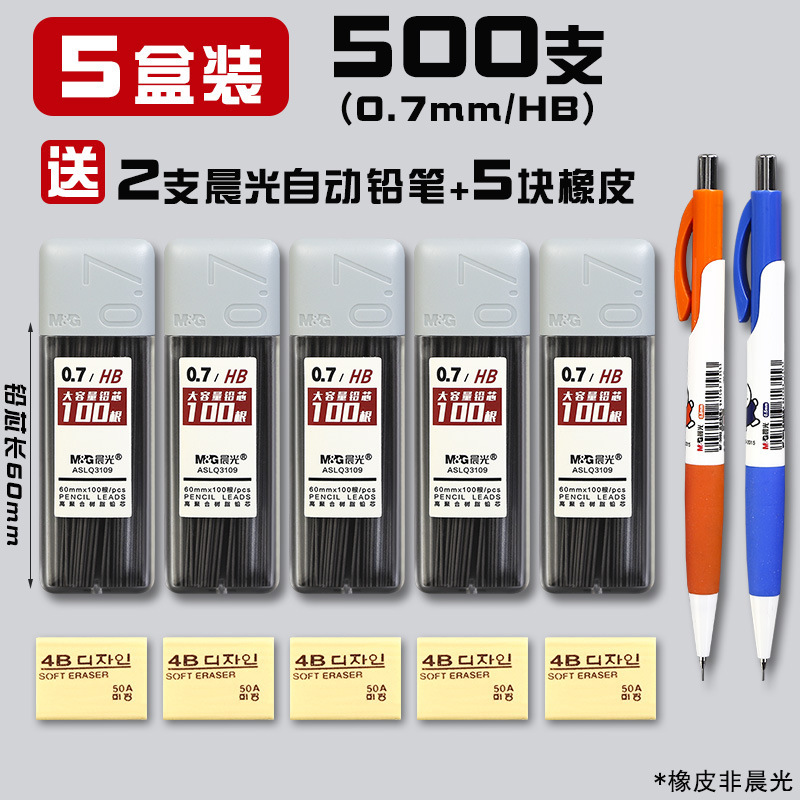 • 0.7/HB(500개) 5박스에 모닝라이트 자동연필 2개 + 지우개 5개가 들어있습니다.