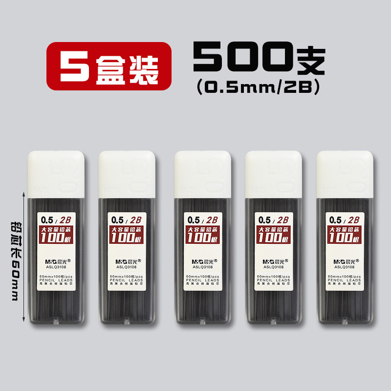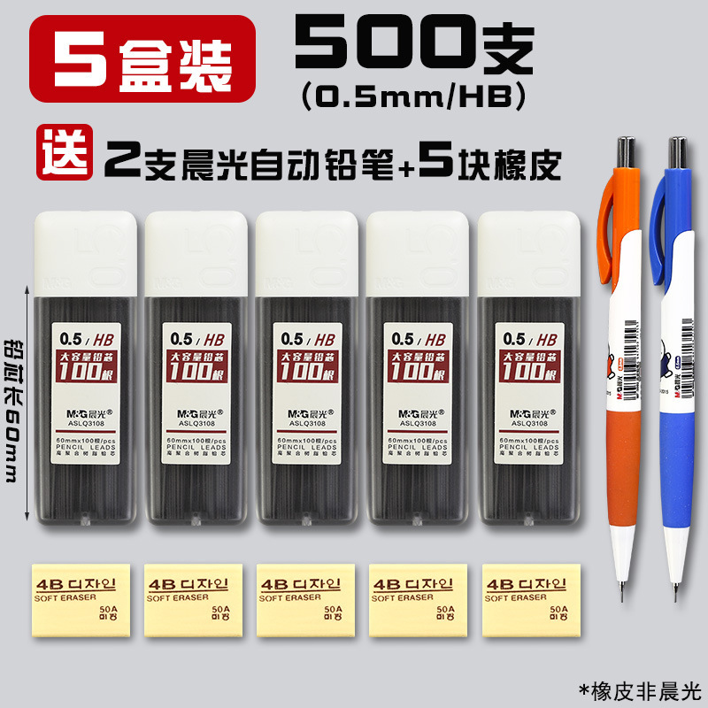 • 0.5/HB(500개) 5박스에 모닝라이트 자동연필 2개 + 지우개 5개가 들어있습니다.