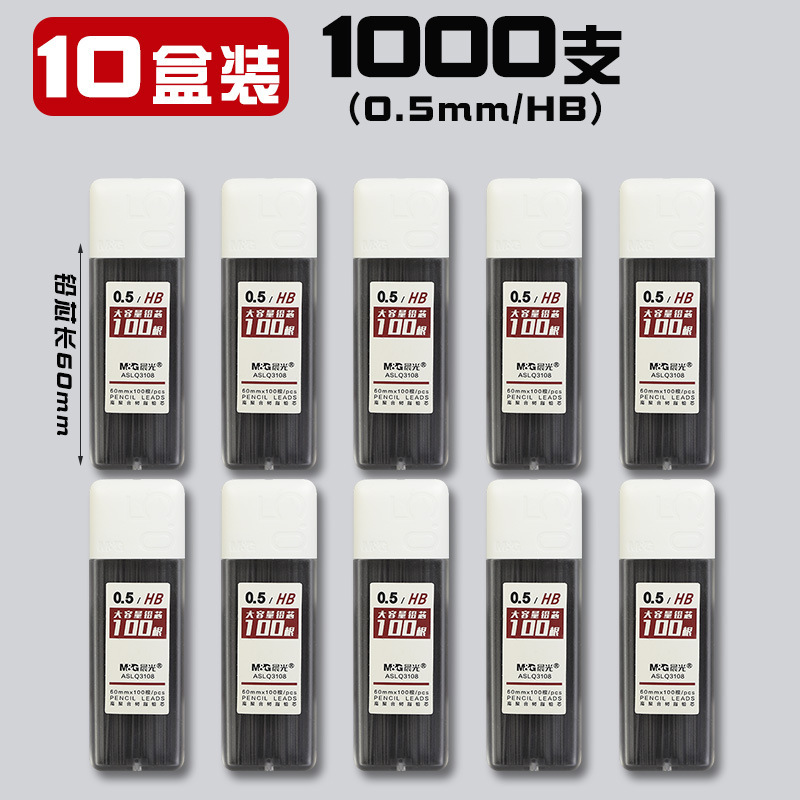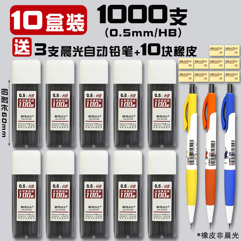• 0.5/HB(1000개) 10박스에 모닝라이트 자동연필 3개 + 지우개 10개가 들어있습니다.