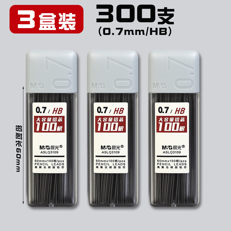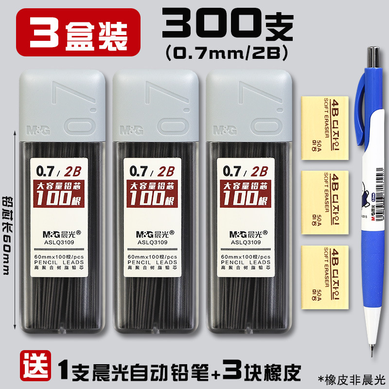 • 0.7/HB(300개) 3박스에 모닝라이트 자동연필 + 지우개 3개가 들어있습니다.