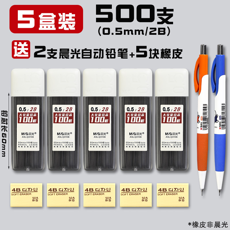 • 0.5/2B(500개) 5박스에 모닝라이트 자동연필 2개 + 지우개 5개가 들어있습니다.