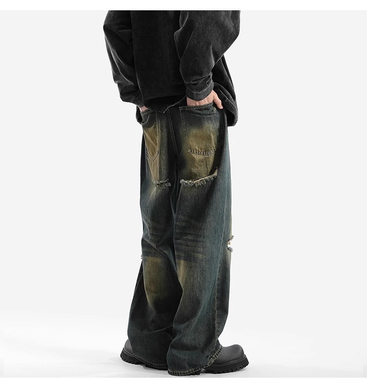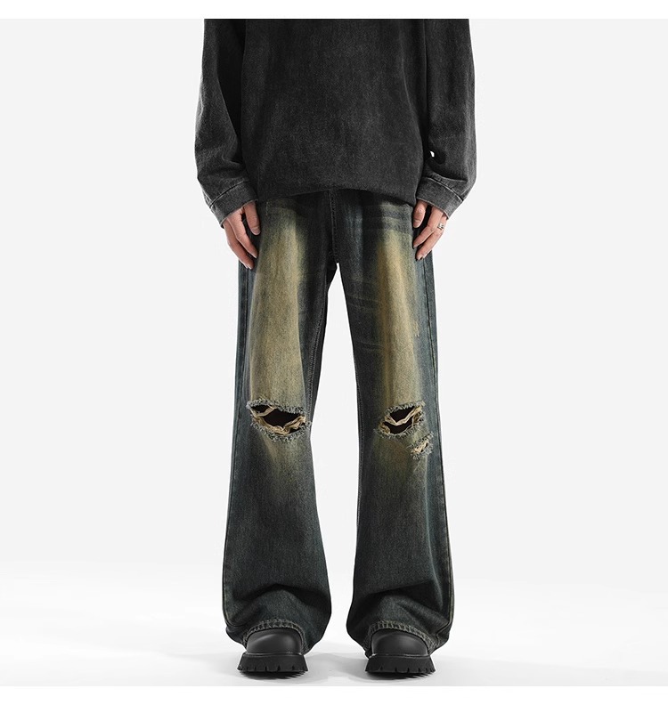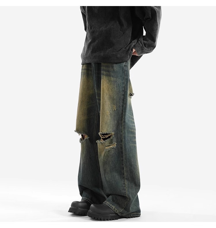남성용 아메리칸 레트로 트렌디 청바지 2025 여름 신작 트렌디 브랜드 루즈 스트레이트 찢어진 와이드 레그 롱 팬츠스토어 가기
