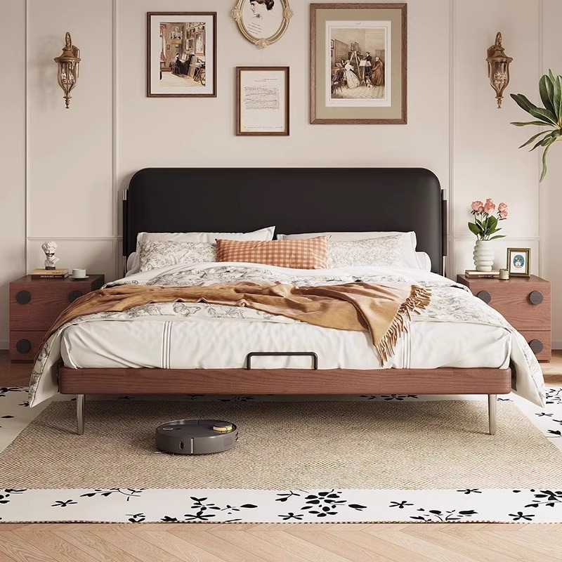 중세 스타일의 원목 왁스 가죽 침대, 우아하고 모던하며 심플한 마스터 침실 프렌치 레트로 침대. 더블 침대