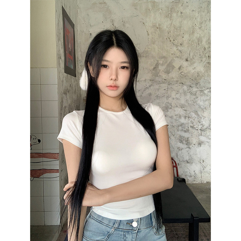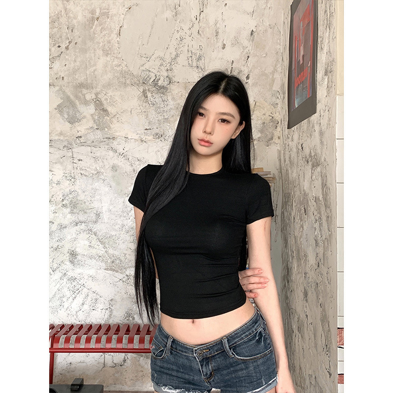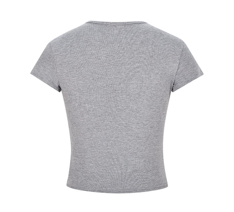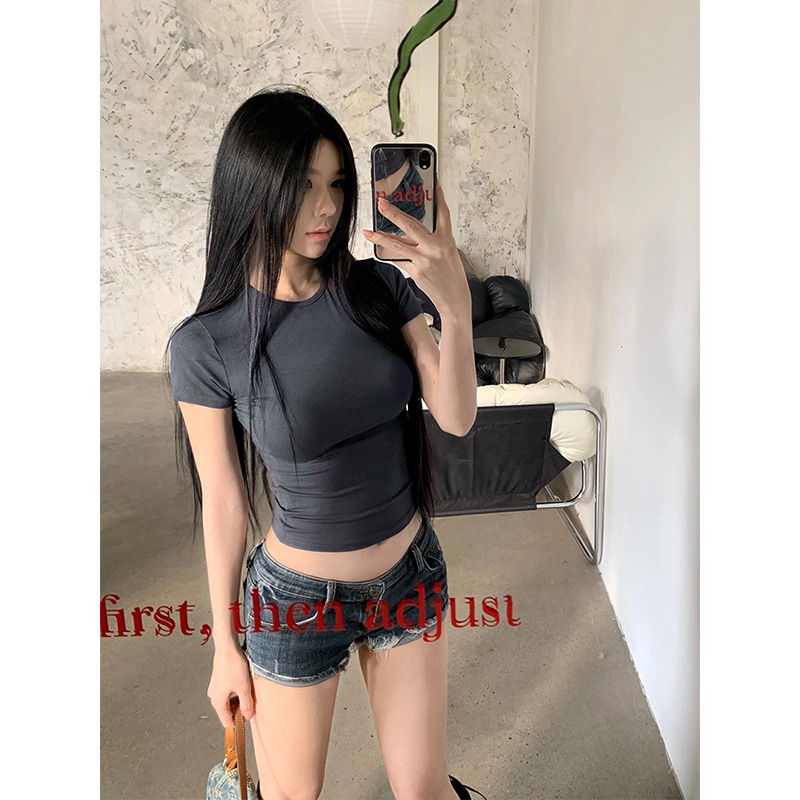 Moses Queen Moses Queen 릴렉스 그레이 라운드 넥 슬림핏 짧은 티셔츠 여성 여름 타이트 슬리밍 탑스토어 가기