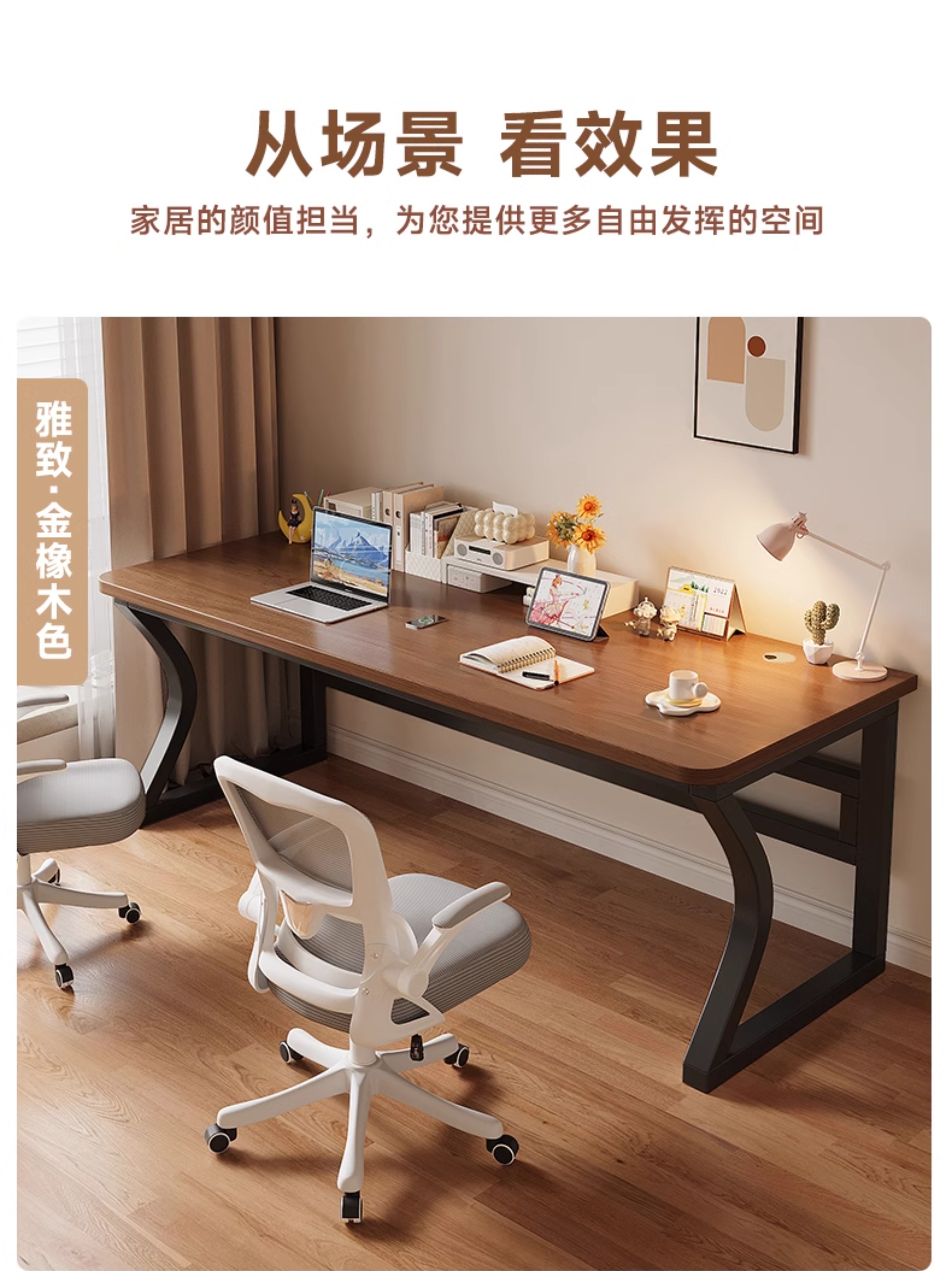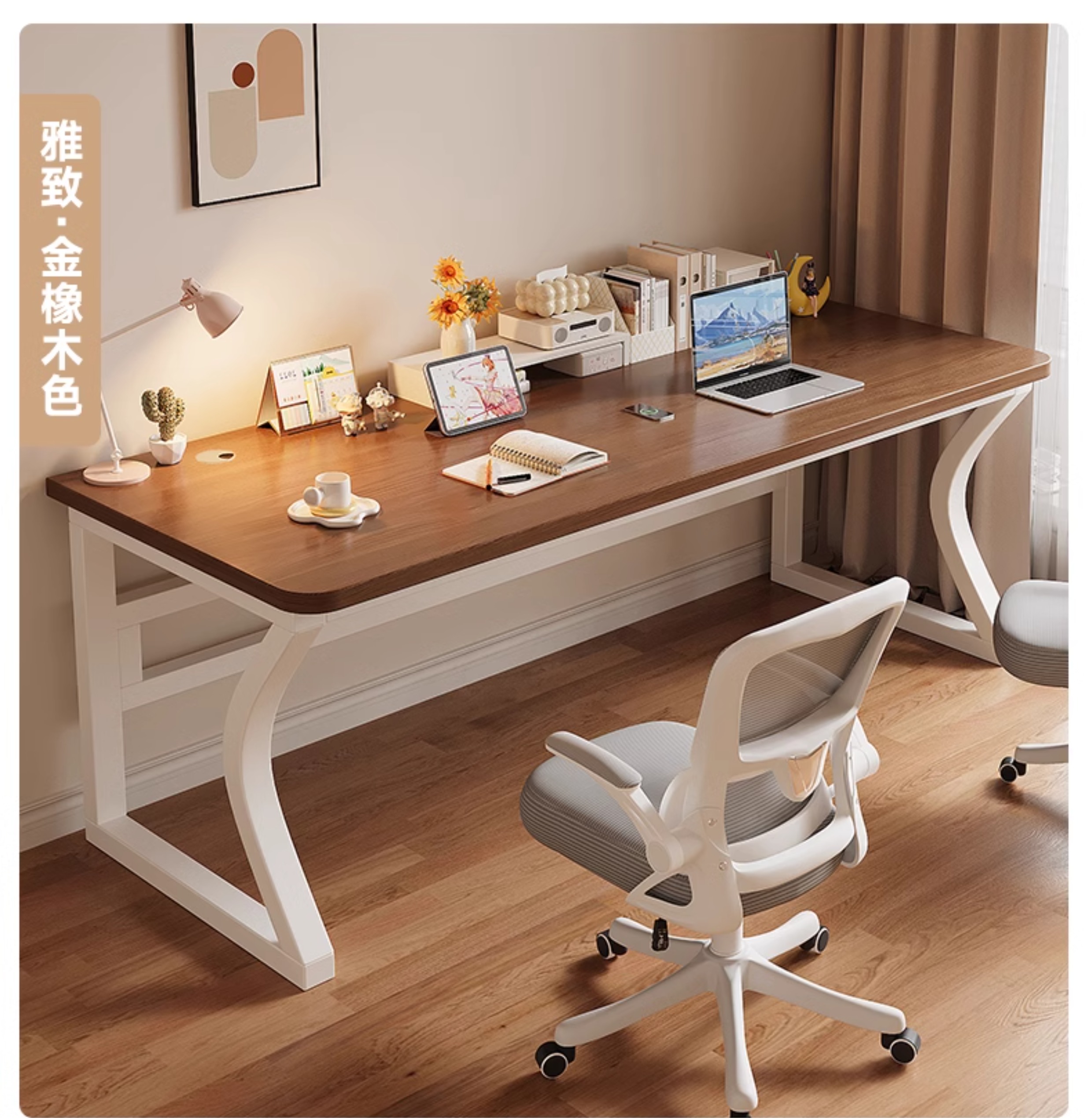 • 골든오크 컬러 데스크탑 + 화이트 선반 [3CM 두꺼운 데스크탑]
