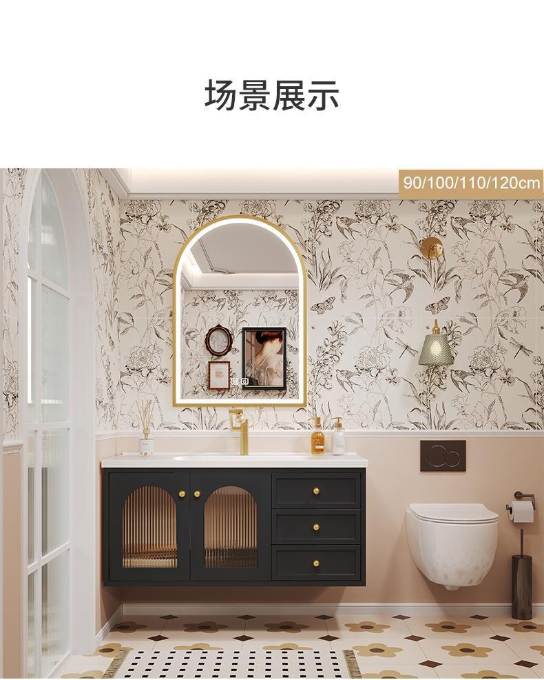 • 액세서리 + 세라믹 세면대가 포함된 90 블랙 골드 프레임 아치형 거울