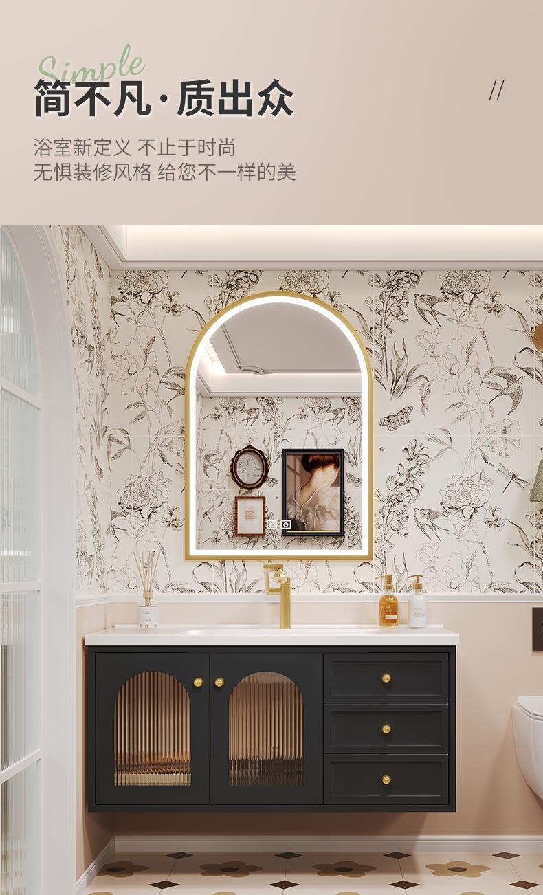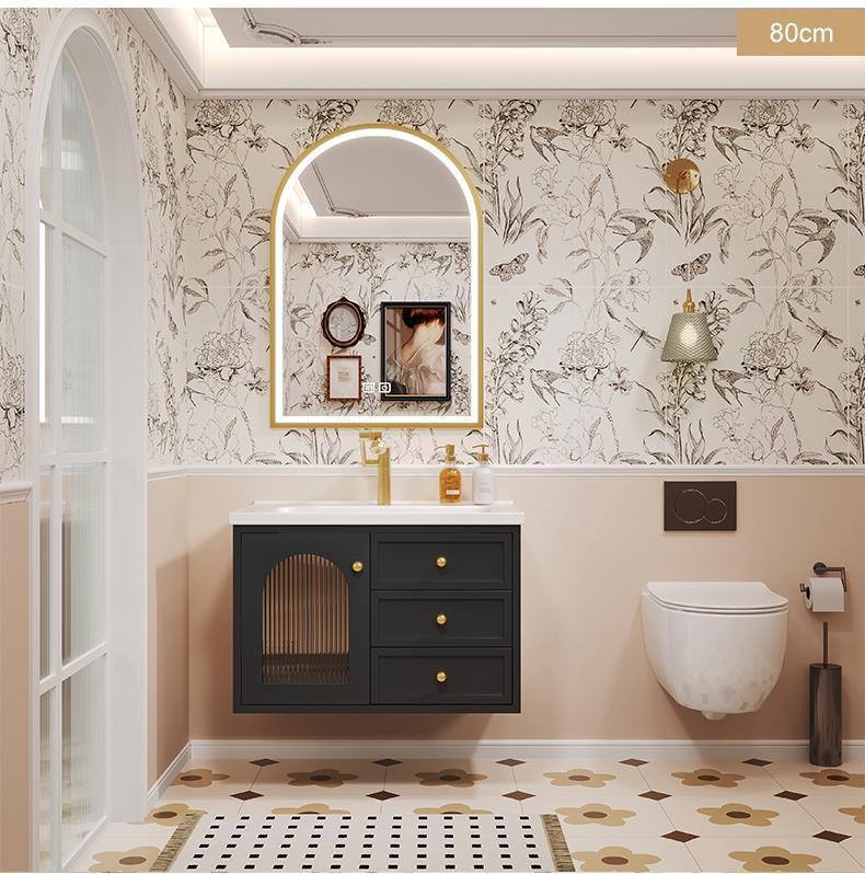 • 액세서리 + 세라믹 세면대가 포함된 80 블랙 골드 프레임 아치형 거울