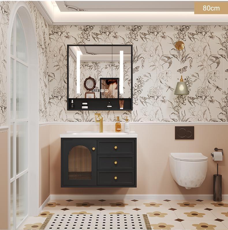 • 액세서리 + 세라믹 세면대가 포함된 80 블랙 스마트 거울 캐비닛