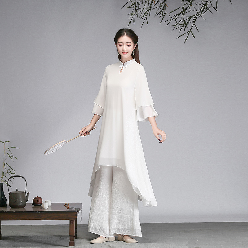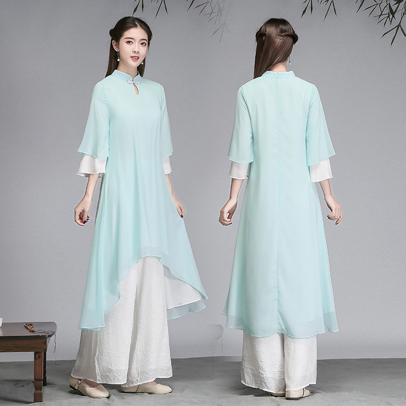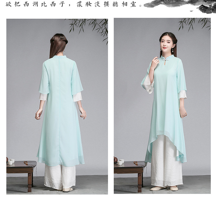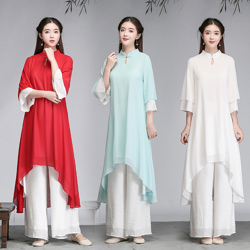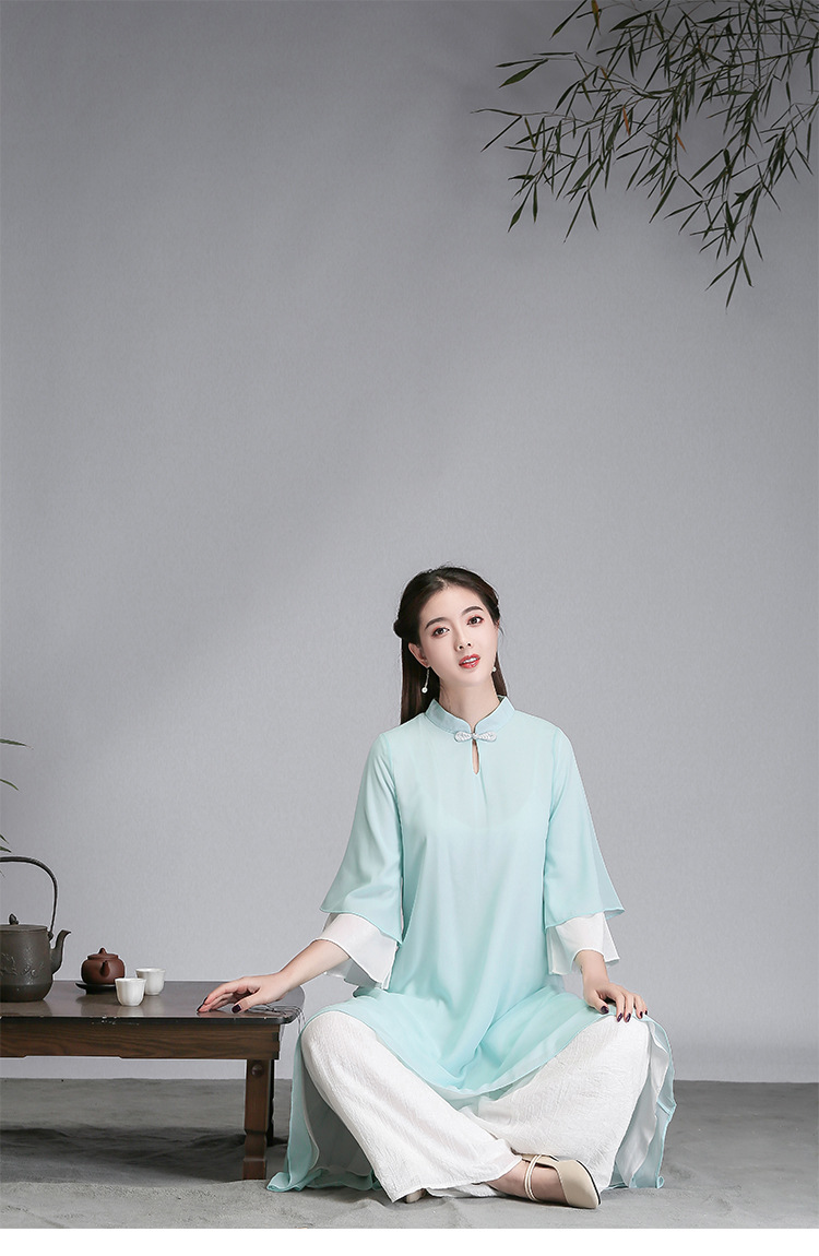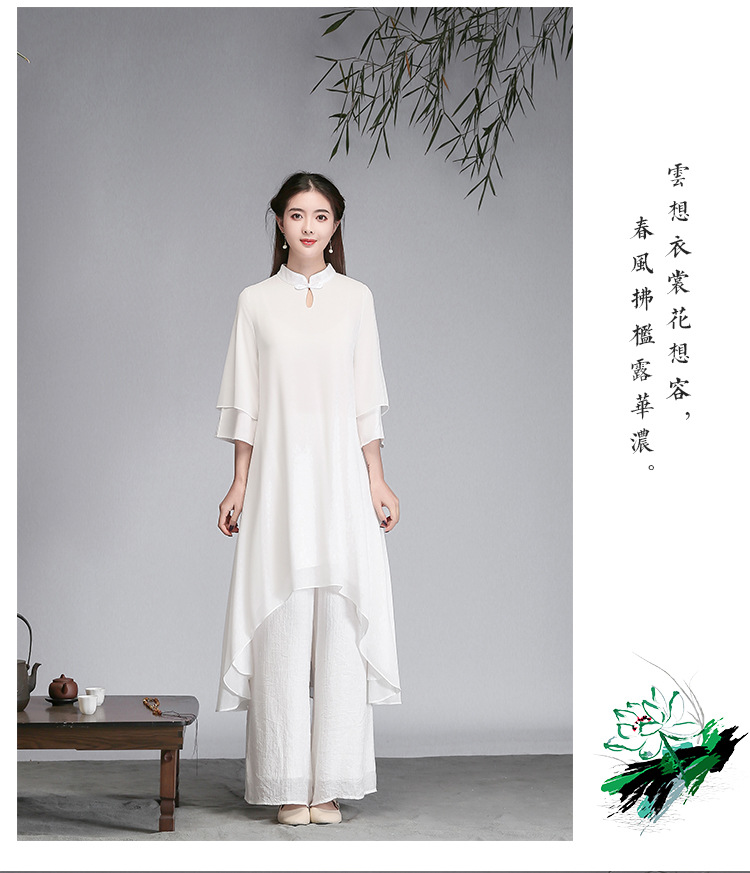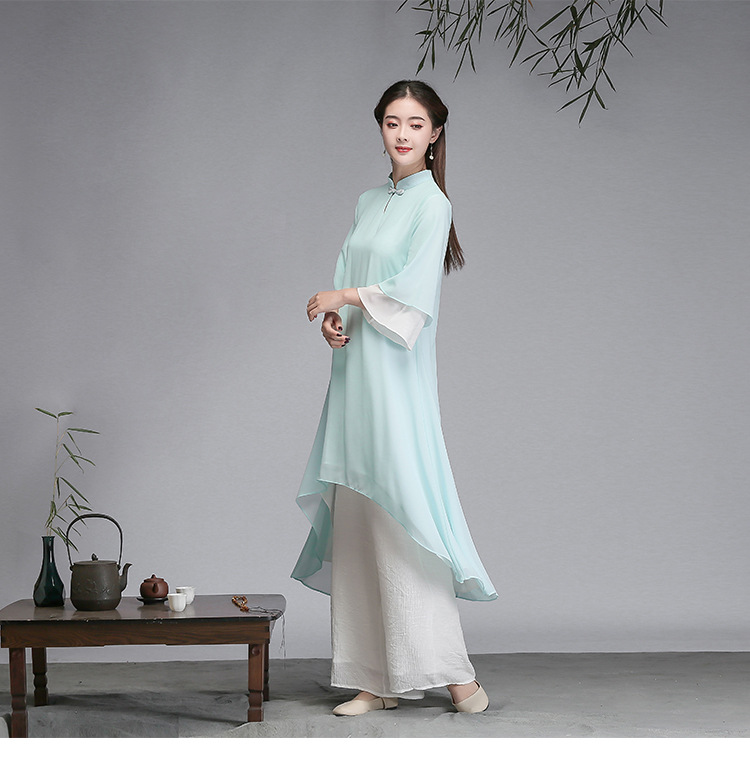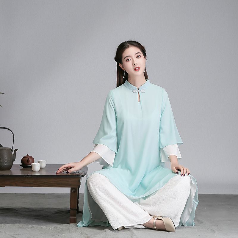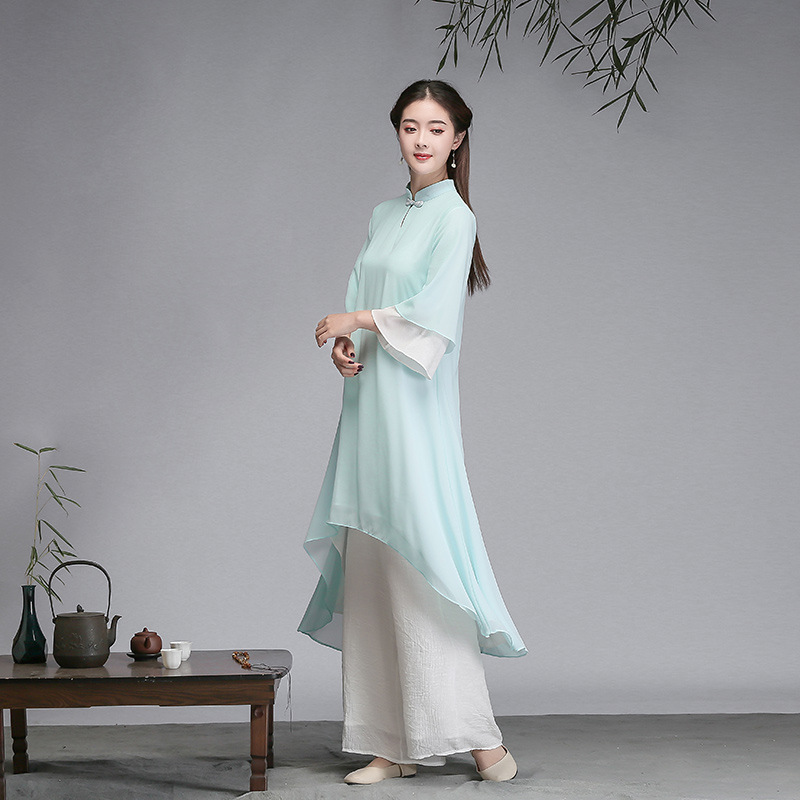 중국 스타일 선 여성 쉬폰 드레스 차 의류 선 명상 의류 선 댄스 의류 복고풍 스타일 Hanfu 투피스 세트스토어 가기