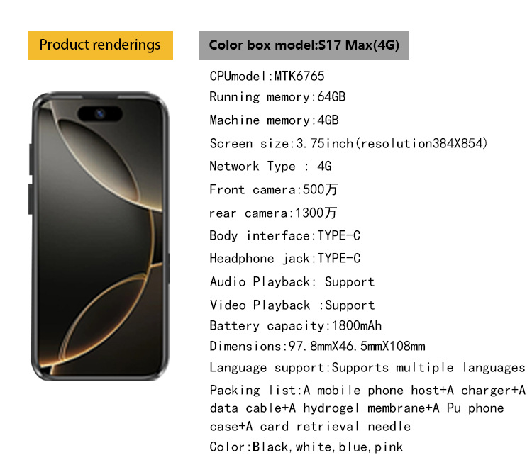 국경 간 새로운 S17Max 스마트 폰 4G 전체 네트워크 듀얼 카드 듀얼 대기 얼굴 인식 미니 학생 소형 휴대 전화