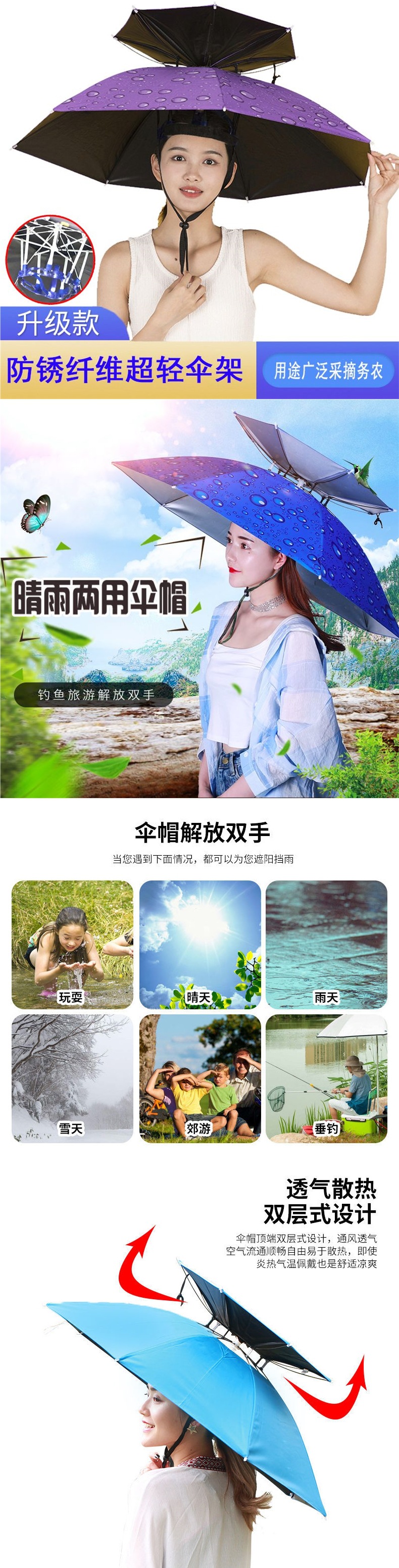 새로운 우산 모자, 이중층 초경량 녹 방지 헤드 장착형 낚시 우산, 야외 태양 우산, 차 따기 및 농장 작업 모자스토어 가기