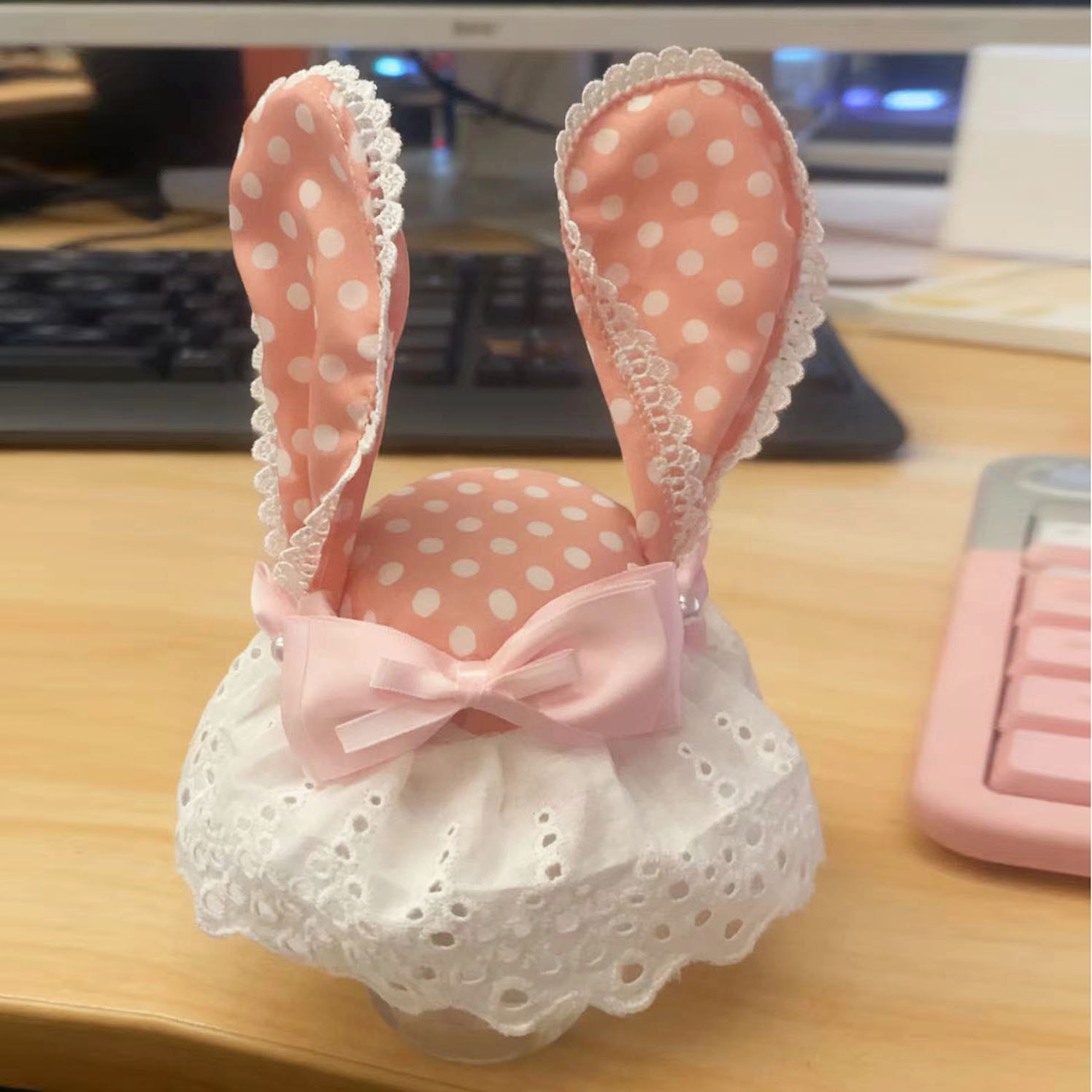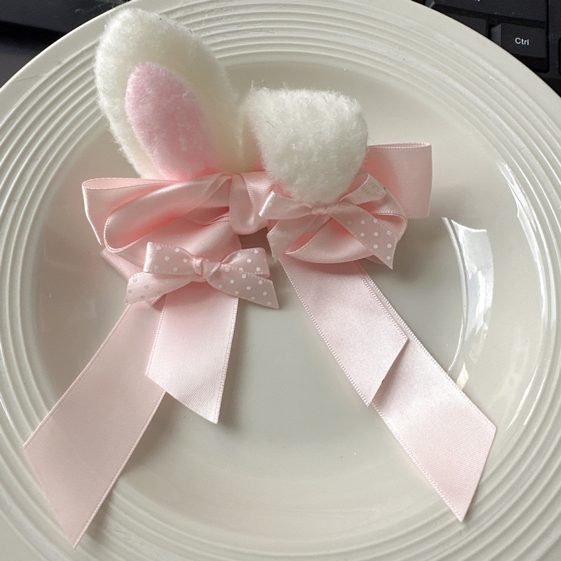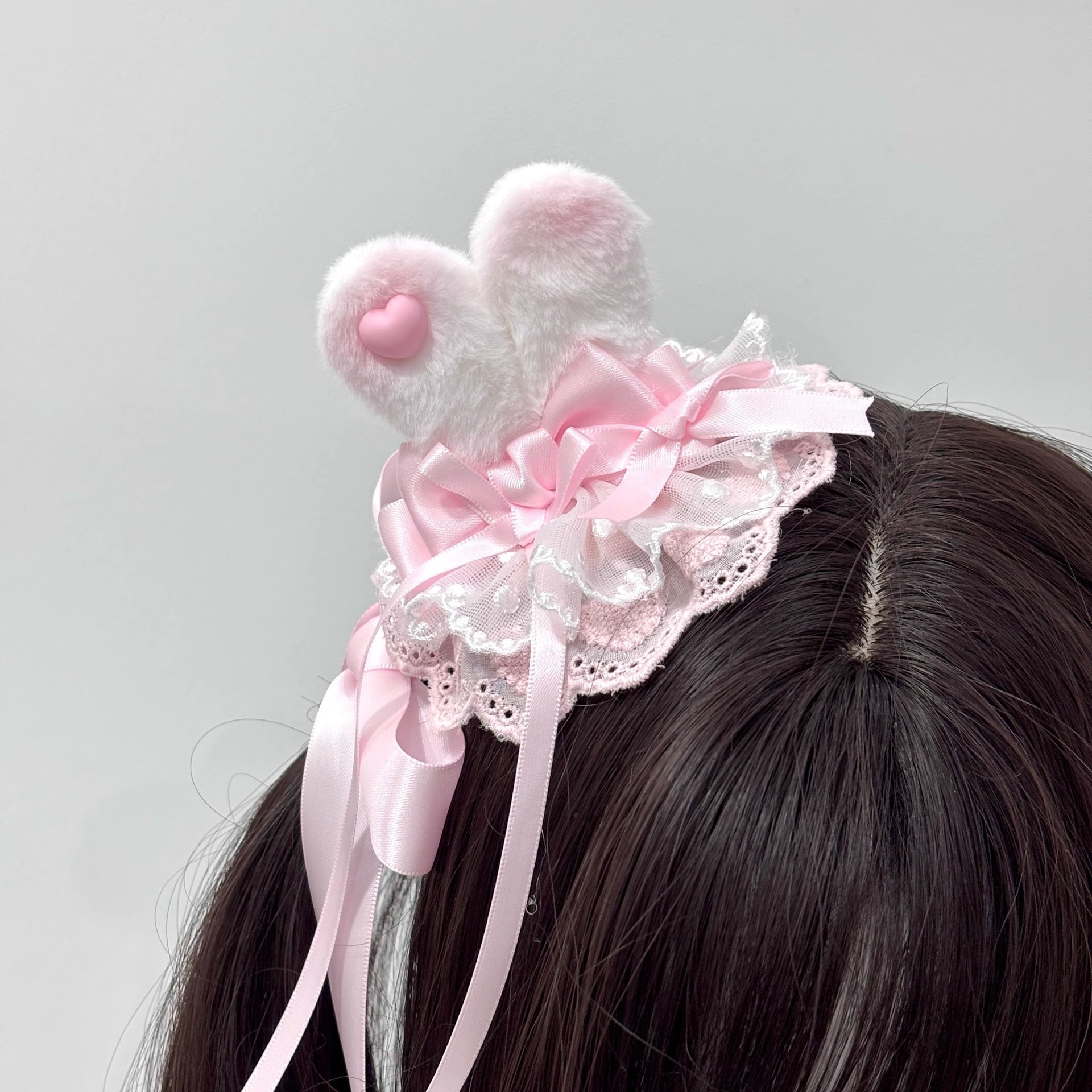 • 레이스 도트 핑크 토끼 귀 머리핀 1개