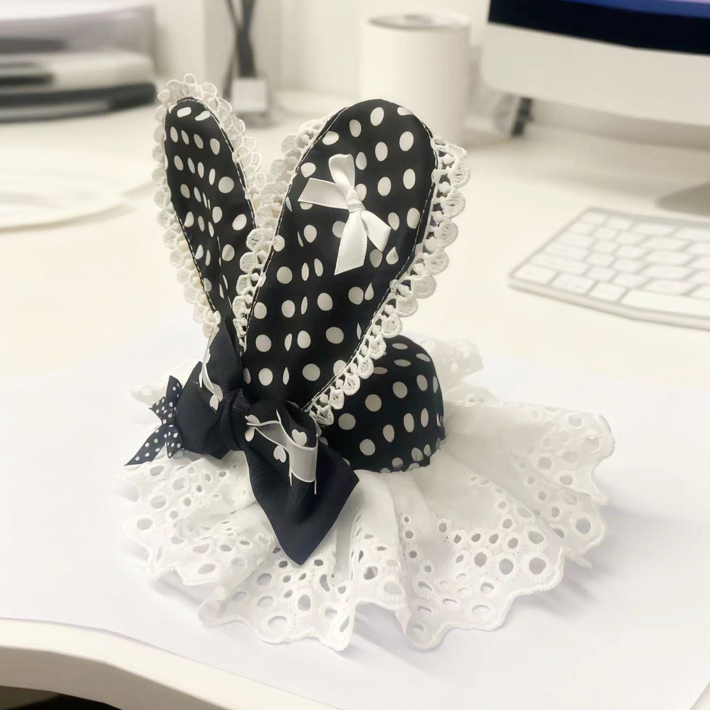 • 레이스 도트 블랙 토끼 귀 머리핀 1개