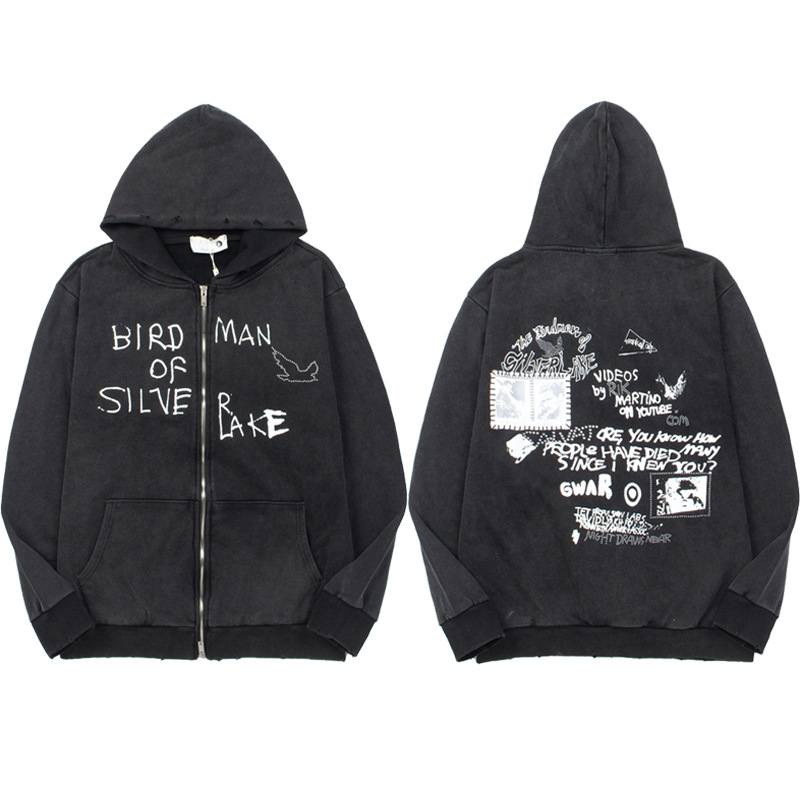 2025년 크로스보더 트렌드 아메리칸 스타일 워싱 레트로 디스트로이드 빈티지 지퍼 후드티 자켓