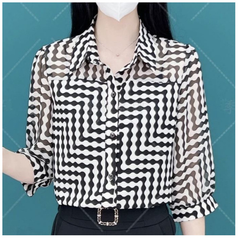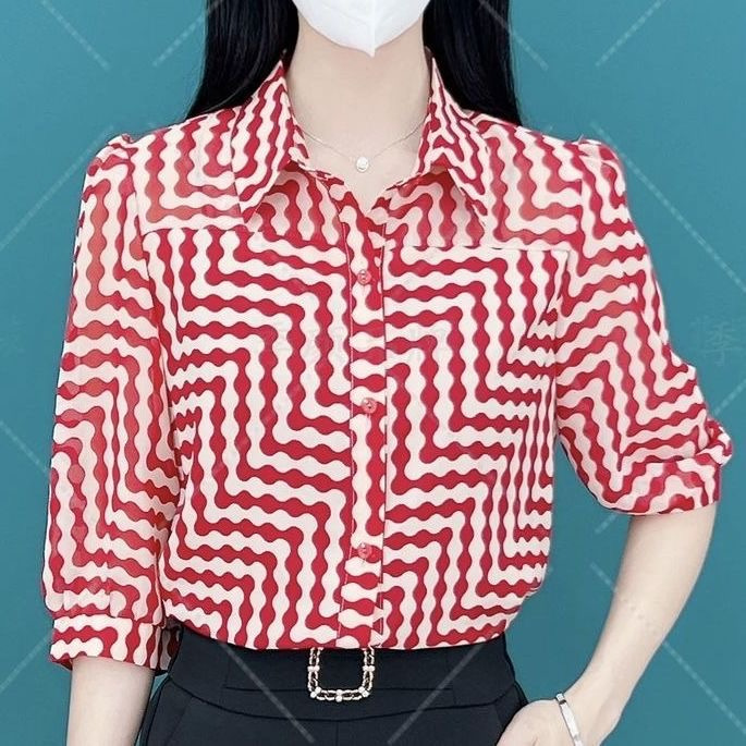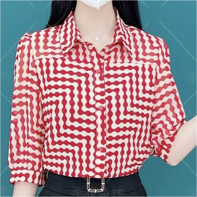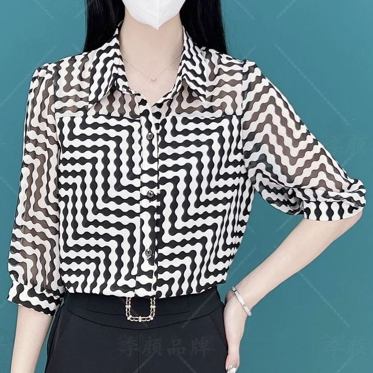 40~50대 엄마를 위한 여성 여름 쉬폰 셔츠 2024년 새 엄마복, 고급 기질의 얇은 셔츠로 나이를 줄이고 날씬해 보입니다.